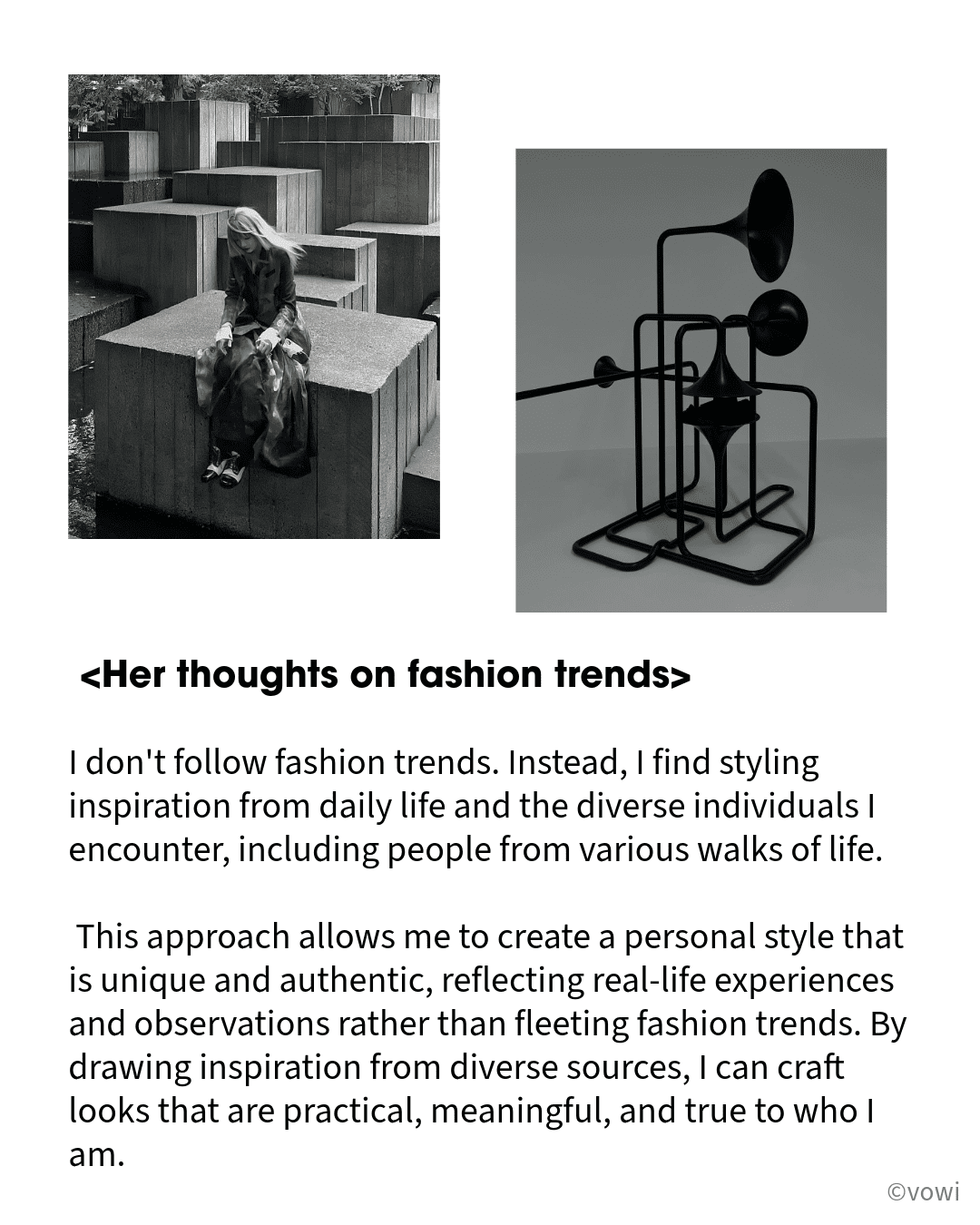 I don’t follow fashion trends. Instead, I find styling inspiration from daily life and the diverse individuals I encounter, including people from various walks of life.