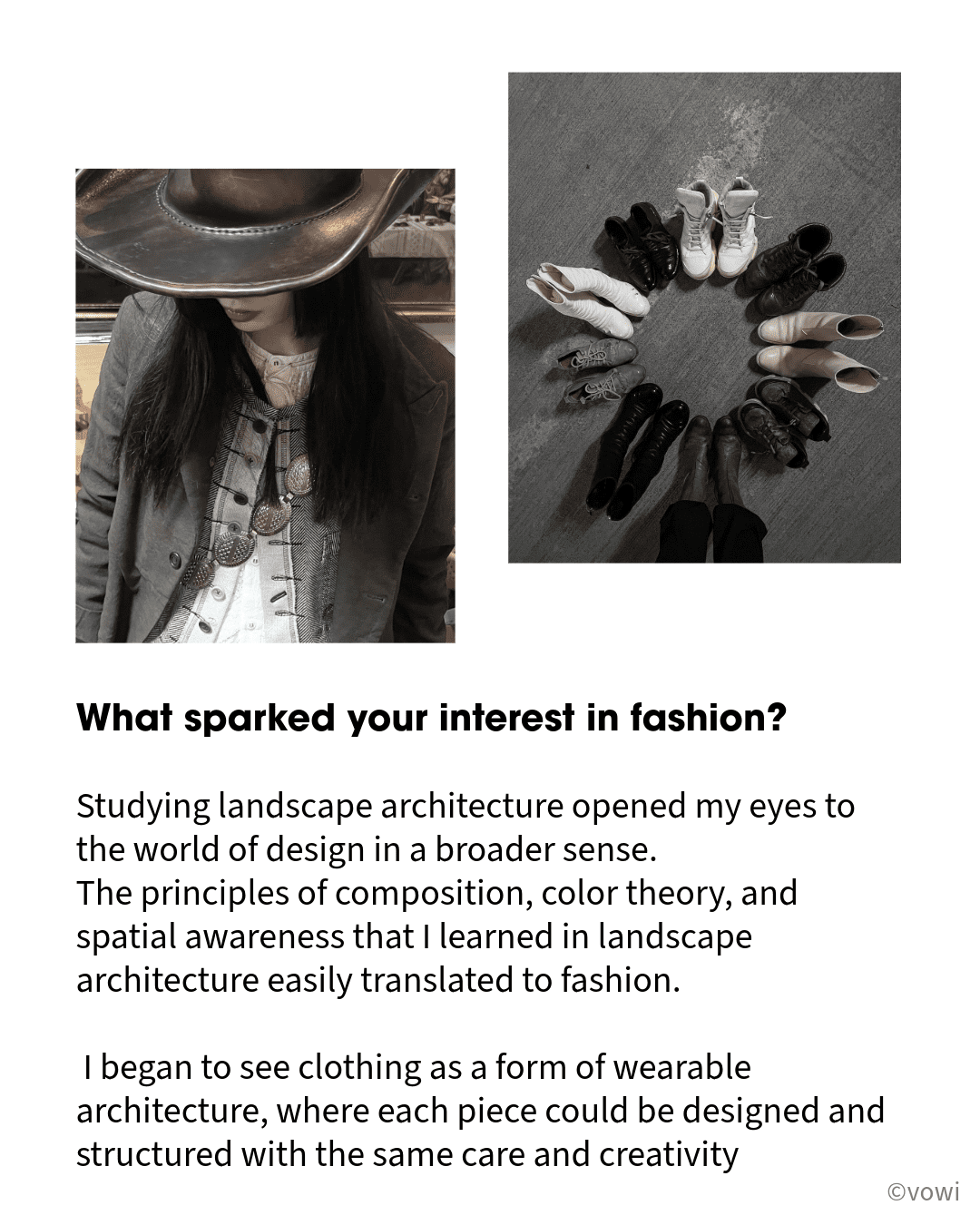 Studying landscape architecture opened my eyes to the world of design in a broader sense. The principles of composition, color theory, and spatial awareness that I learned in landscape architecture easily translated to fashion. I began to see clothing as a form of wearable architecture, where each piece could be designed and structured with the same care and creativity