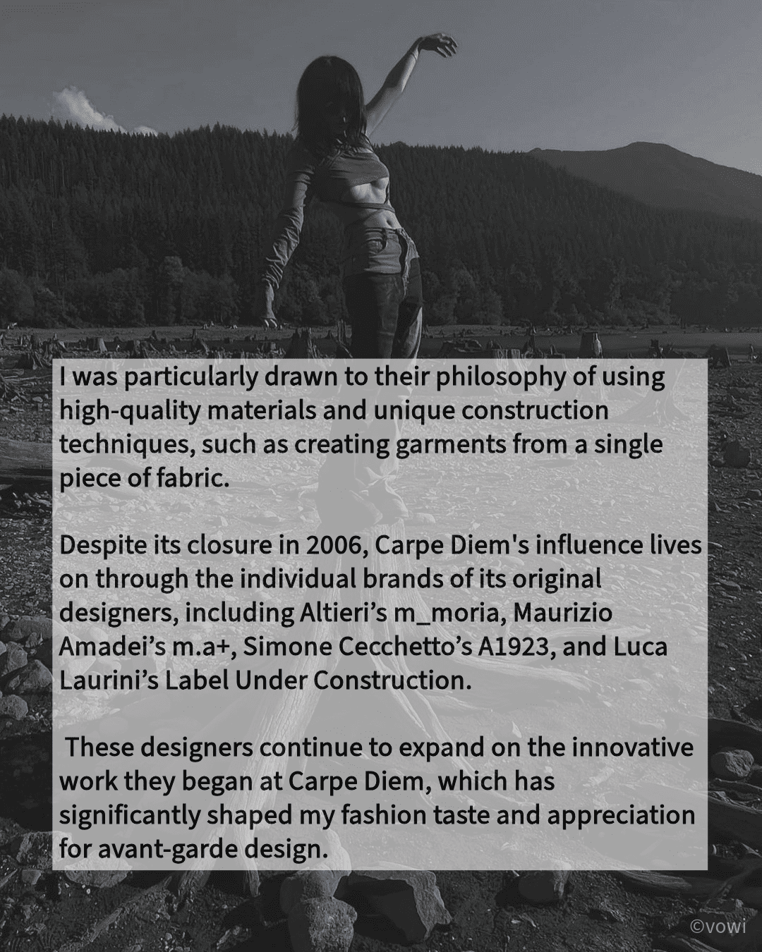 These designers continue to expand on the innovative work they began at Carpe Diem, which has significantly shaped my fashion taste and appreciation for avant-garde design.