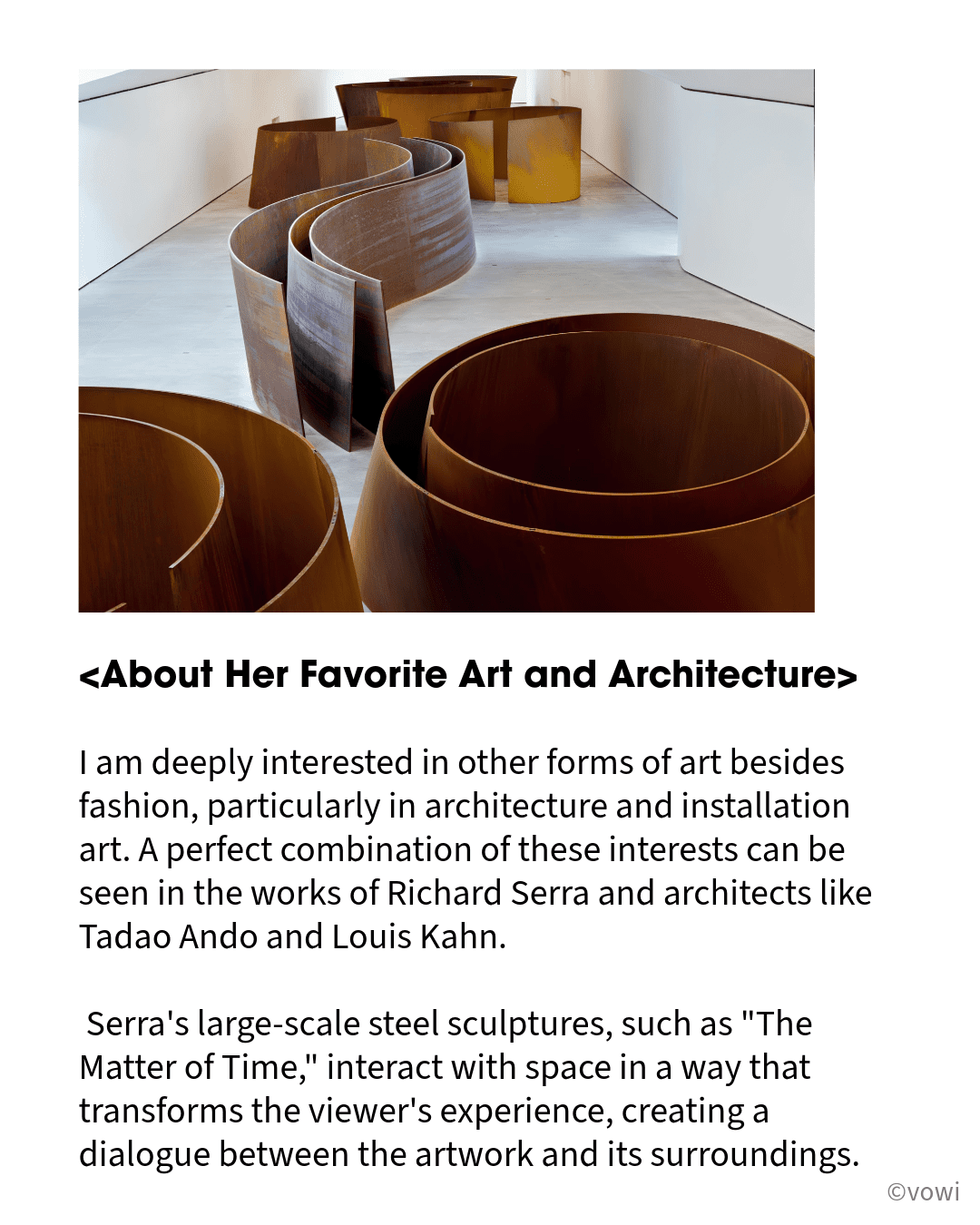 I am deeply interested in other forms of art besides fashion, particularly in architecture and installation art. A perfect combination of these interests can be seen in the works of Richard Serra and architects like Tadao Ando and Louis Kahn. Serra’s large-scale steel sculptures, such as “The Matter of Time,” interact with space in a way that transforms the viewer’s experience, creating a dialogue between the artwork and its surroundings.
