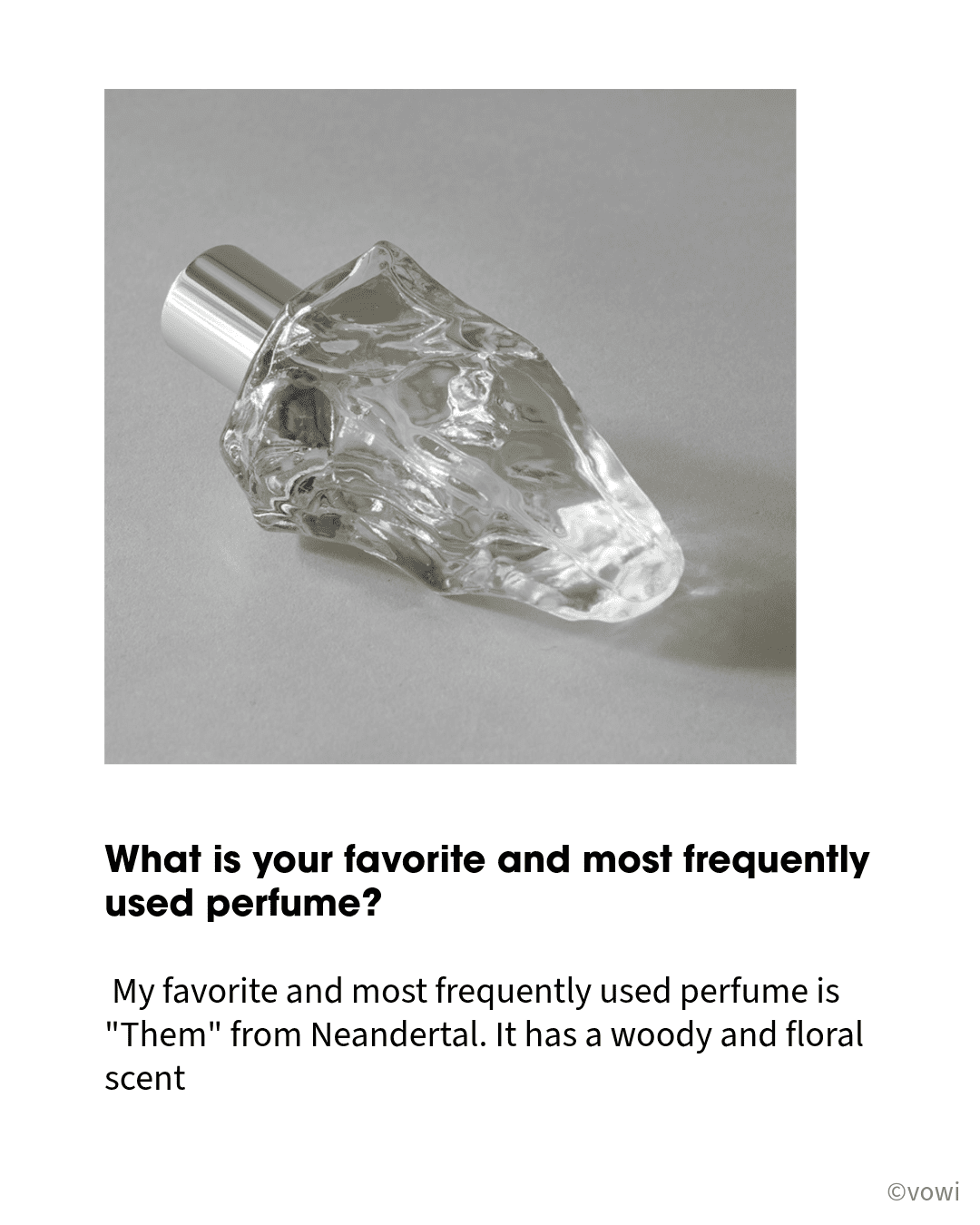 My favorite and most frequently used perfume is “Them” from Neandertal. It has a woody and floral scent