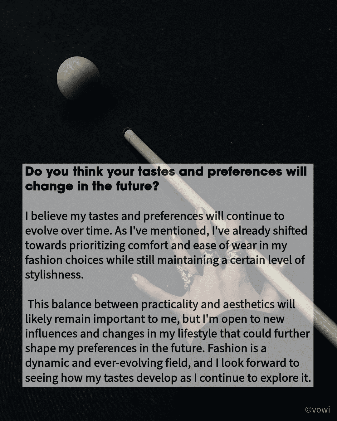 This balance between practicality and aesthetics will likely remain important to me, but I’m open to new influences and changes in my lifestyle that could further shape my preferences in the future. Fashion is a dynamic and ever-evolving field, and I look forward to seeing how my tastes develop as I continue to explore it.