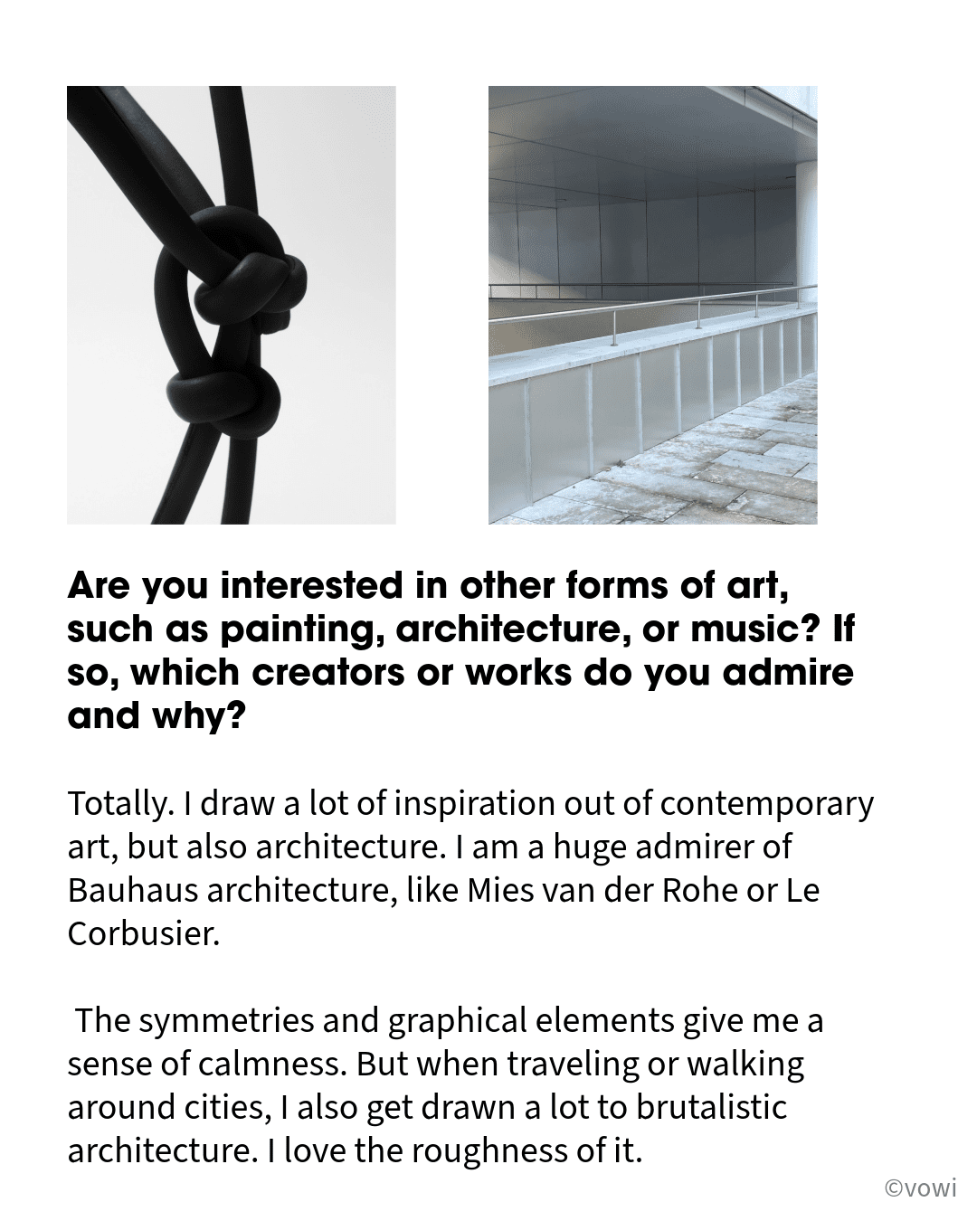 If so, which creators or works do you admire and why? Totally. I draw a lot of inspiration out of contemporary art, but also architecture. I am a huge admirer of Bauhaus architecture, like Mies van der Rohe or Le Corbusier. The symmetries and graphical elements give me a sense of calmness. But when traveling or walking around cities, I also get drawn a lot to brutalistic architecture. I love the roughness of it.