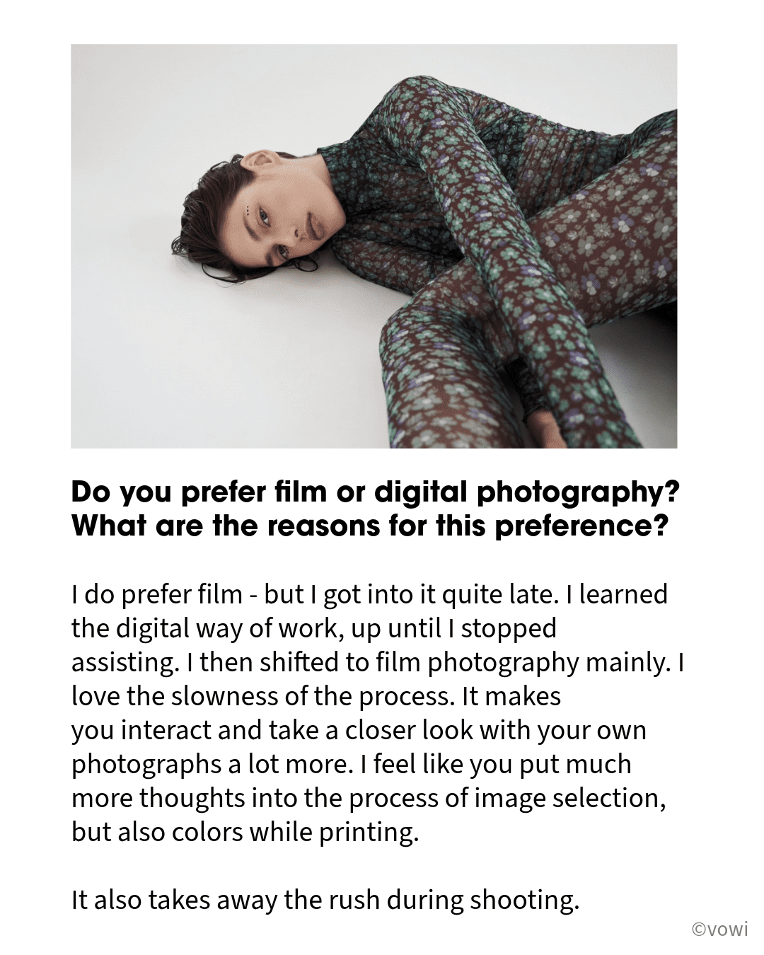 What are the reasons for this preference? I do prefer film – but I got into it quite late. I learned the digital way of work, up until I stopped assisting. I then shifted to film photography mainly. I love the slowness of the process. It makes you interact and take a closer look with your own photographs a lot more. I feel like you put much more thoughts into the process of image selection, but also colors while printing.