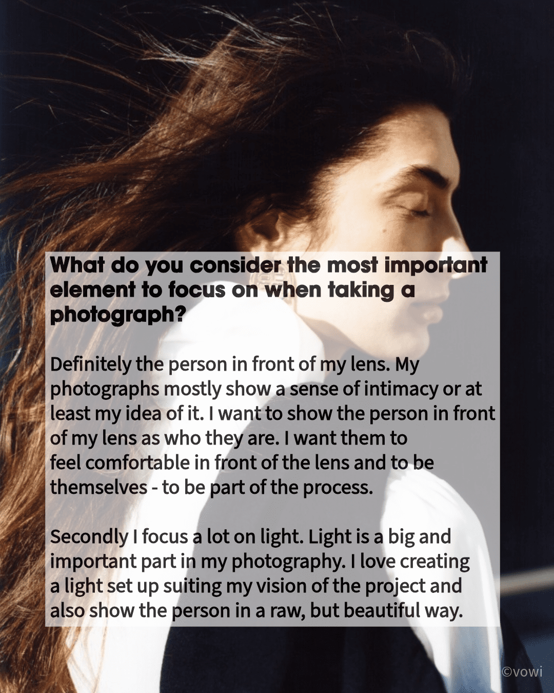 Secondly I focus a lot on light. Light is a big and important part in my photography. I love creating a light set up suiting my vision of the project and also show the person in a raw, but beautiful way.