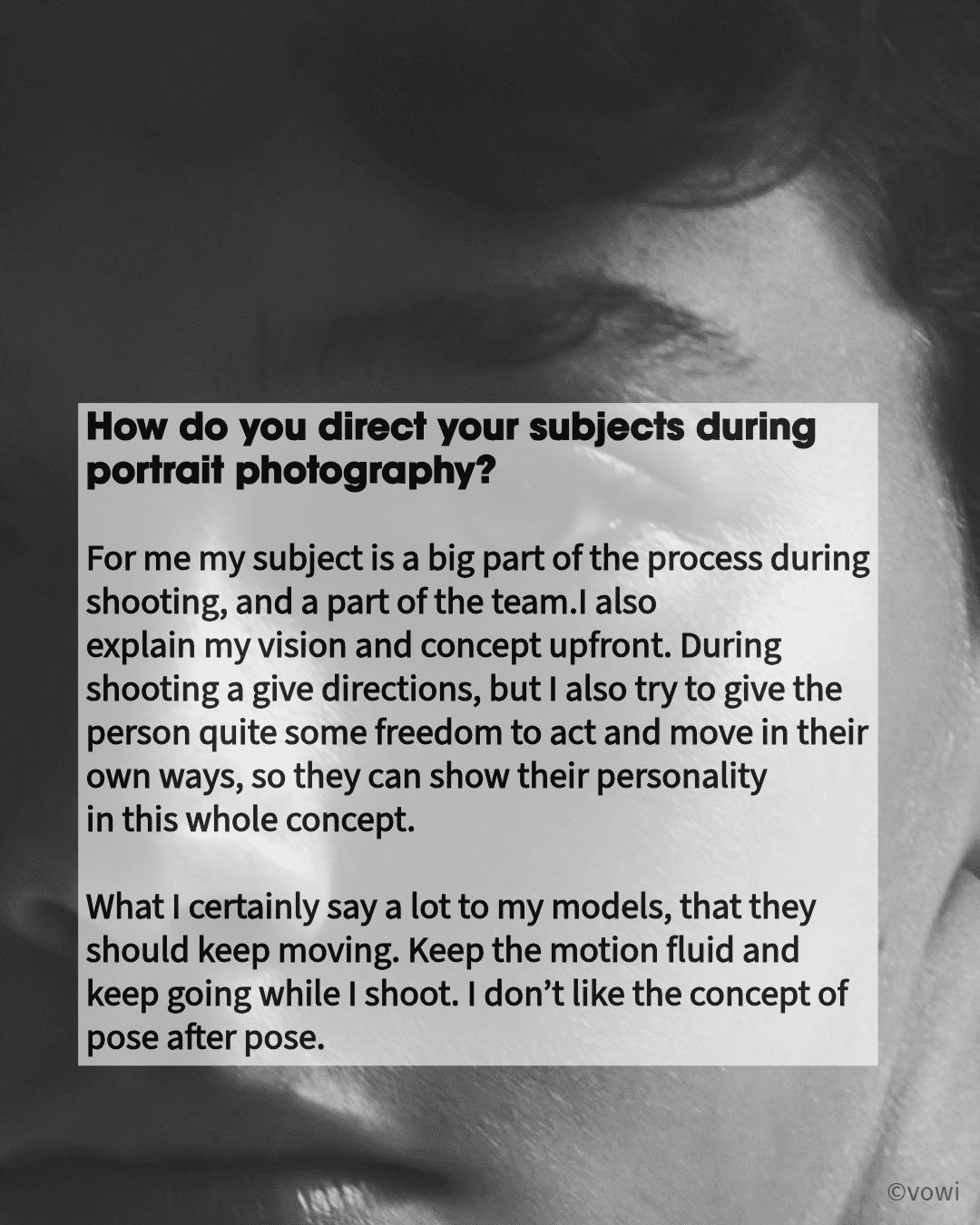 For me my subject is a big part of the process during shooting, and a part of the team.I also explain my vision and concept upfront. During shooting a give directions, but I also try to give the person quite some freedom to act and move in their own ways, so they can show their personality in this whole concept.