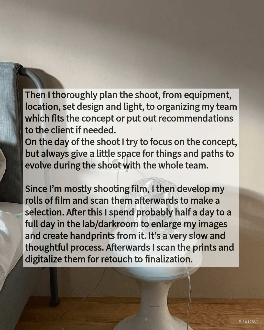 Since I’m mostly shooting film, I then develop my rolls of film and scan them afterwards to make a selection. After this I spend probably half a day to a full day in the lab/darkroom to enlarge my images and create handprints from it. It’s a very slow and thoughtful process. Afterwards I scan the prints and digitalize them for retouch to finalization.