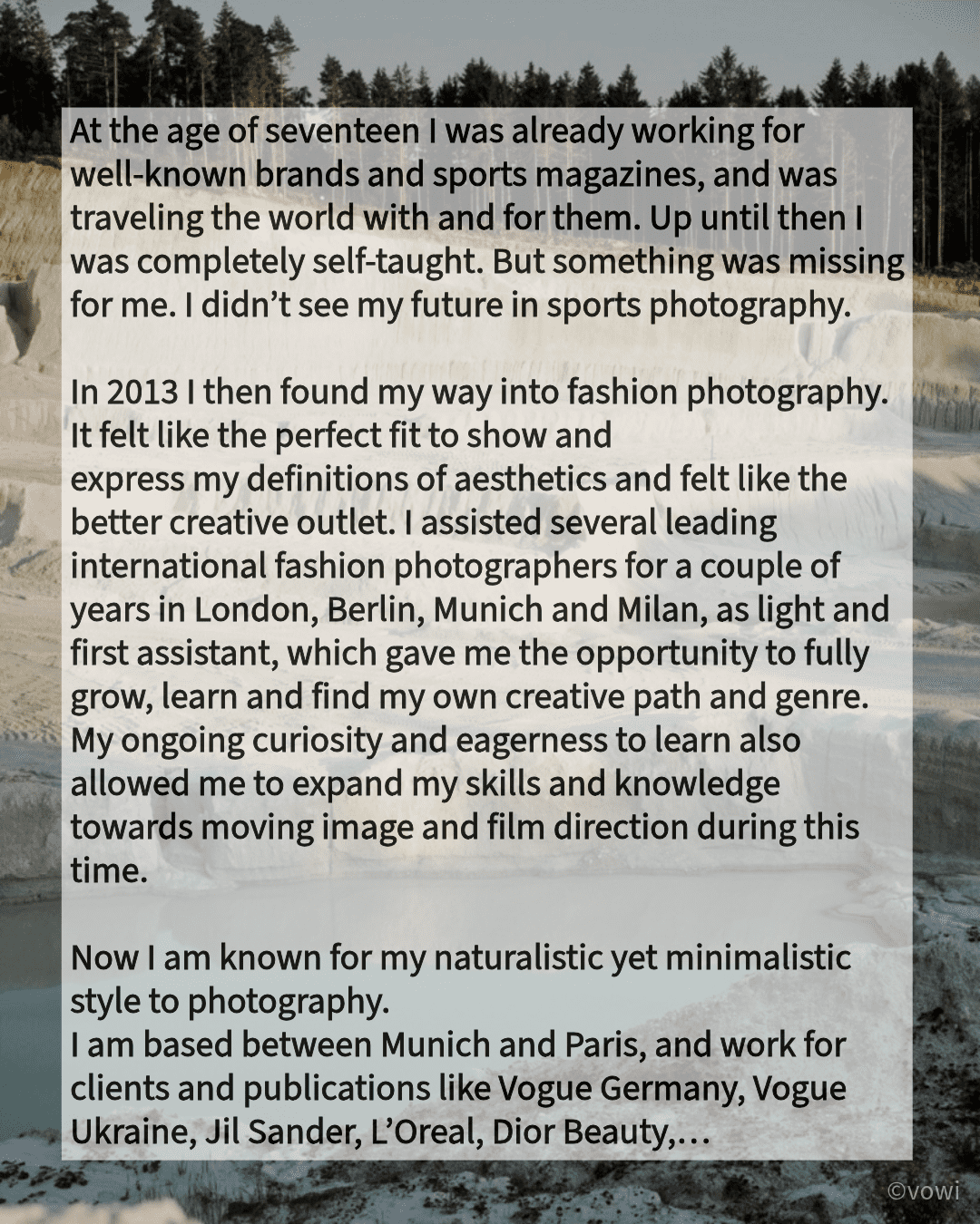 Now I am known for my naturalistic yet minimalistic style to photography. I am based between Munich and Paris, and work for clients and publications like Vogue Germany, Vogue Ukraine, Jil Sander, L’Oreal, Dior Beauty,…