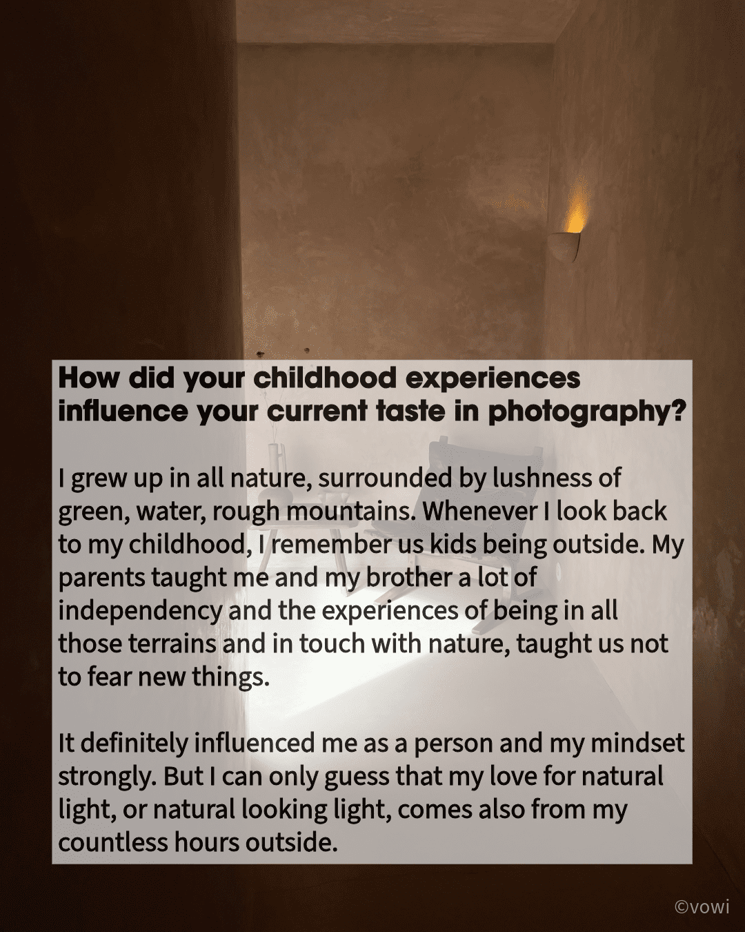 I grew up in all nature, surrounded by lushness of green, water, rough mountains. Whenever I look back to my childhood, I remember us kids being outside. My parents taught me and my brother a lot of independency and the experiences of being in all those terrains and in touch with nature, taught us not to fear new things. It definitely influenced me as a person and my mindset strongly. But I can only guess that my love for natural light, or natural looking light, comes also from my countless hours outside.