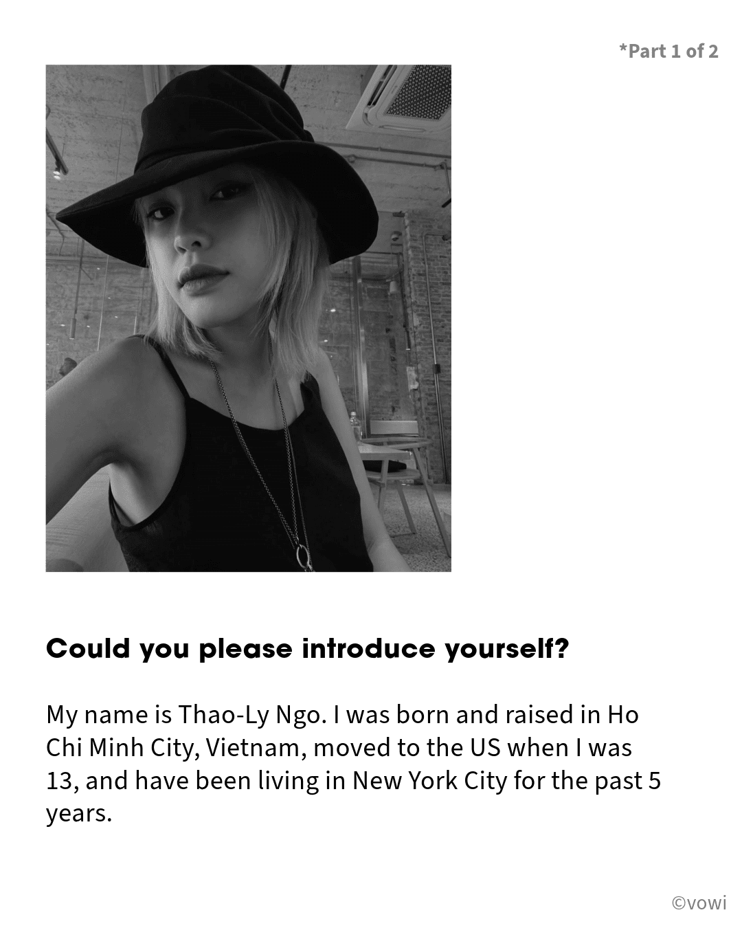 My name is Thao-Ly Ngo. I was born and raised in Ho Chi Minh City, Vietnam, moved to the US when I was 13, and have been living in New York City for the past 5 years.