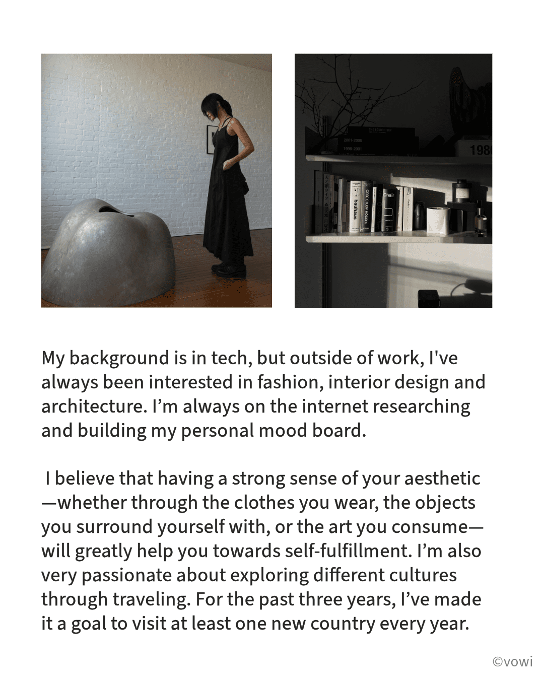My background is in tech, but outside of work, I’ve always been interested in fashion, interior design and architecture. I’m always on the internet researching and building my personal mood board.