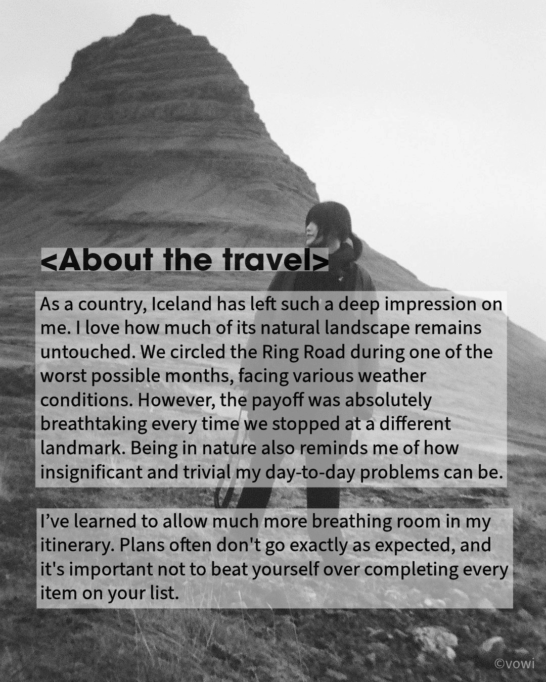 As a country, Iceland has left such a deep impression on me. I love how much of its natural landscape remains untouched. We circled the Ring Road during one of the worst possible months, facing various weather conditions. However, the payoff was absolutely breathtaking every time we stopped at a different landmark. Being in nature also reminds me of how insignificant and trivial my day-to-day problems can be.