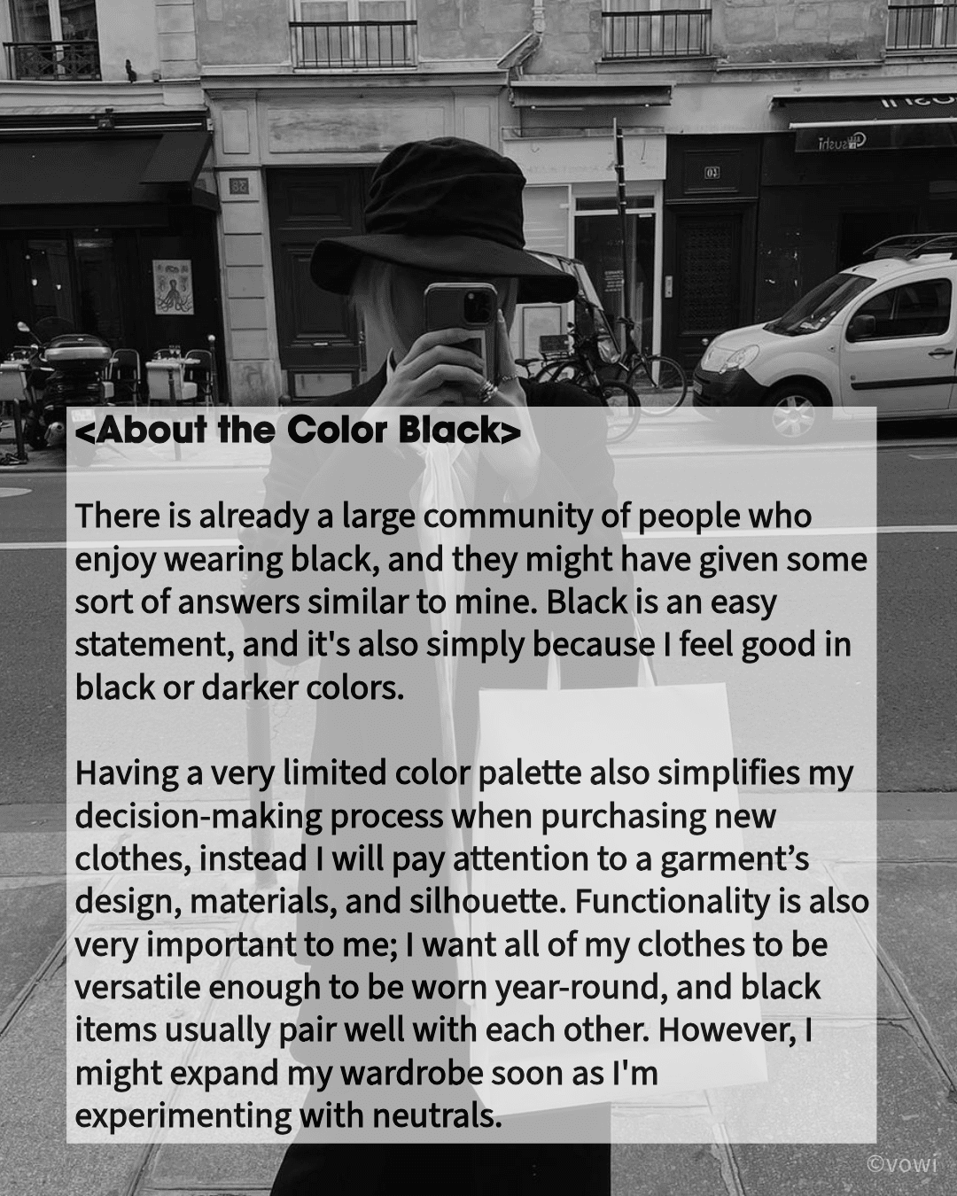 Having a very limited color palette also simplifies my decision-making process when purchasing new clothes, instead I will pay attention to a garment’s design, materials, and silhouette. Functionality is also very important to me; I want all of my clothes to be versatile enough to be worn year-round, and black items usually pair well with each other. However, I might expand my wardrobe soon as I’m experimenting with neutrals.