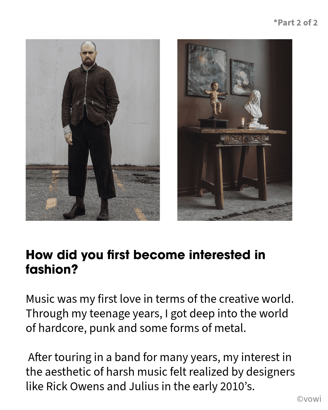 Music was my first love in terms of the creative world. Through my teenage years, I got deep into the world of hardcore, punk and some forms of metal. After touring in a band for many years, my interest in the aesthetic of harsh music felt realized by designers like Rick Owens and Julius in the early 2010’s.