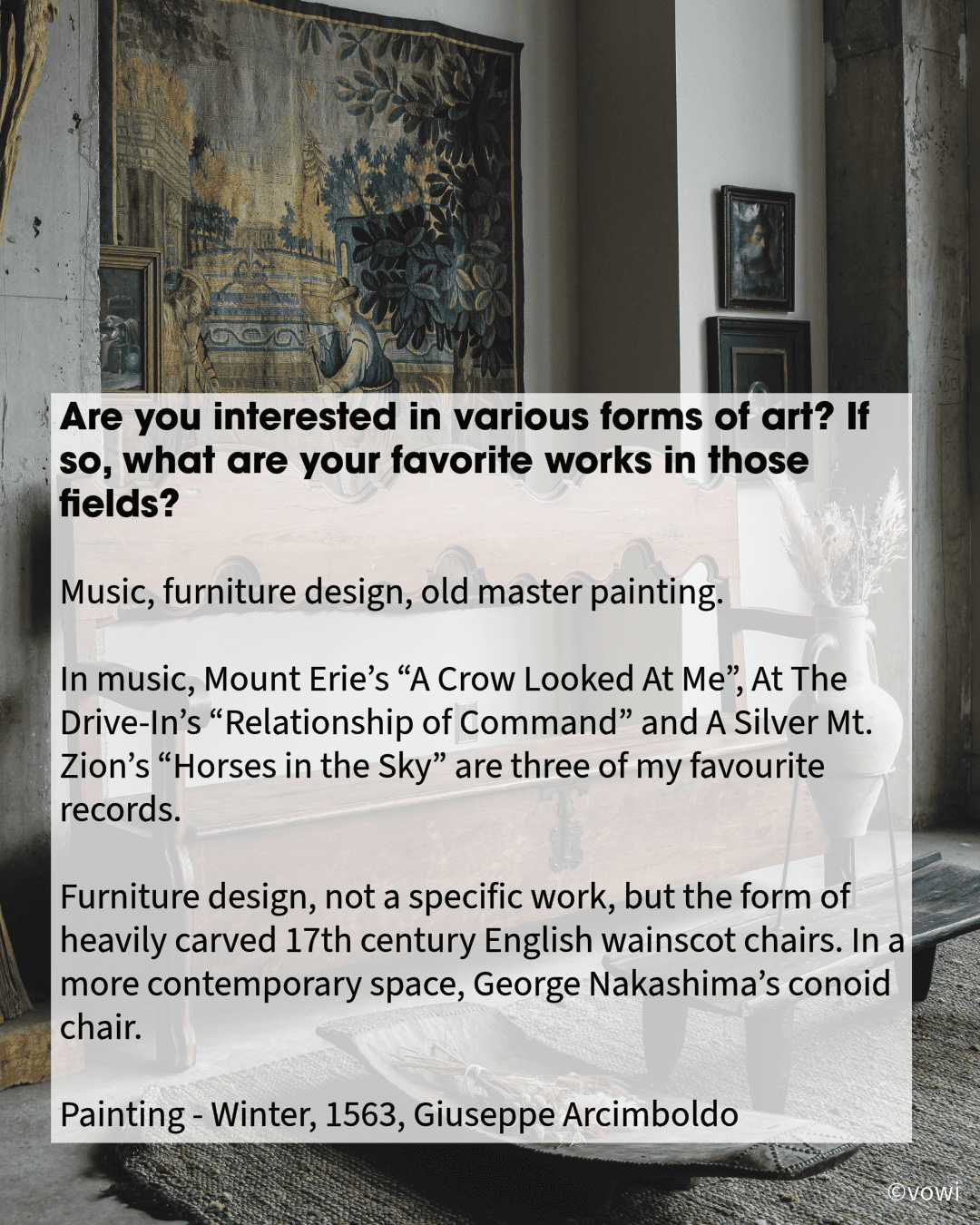 If so, what are your favorite works in those fields? Music, furniture design, old master painting. In music, Mount Erie’s “A Crow Looked At Me”, At The Drive-In’s “Relationship of Command” and A Silver Mt. Zion’s “Horses in the Sky” are three of my favourite records. Furniture design, not a specific work, but the form of heavily carved 17th century English wainscot chairs. In a more contemporary space, George Nakashima’s conoid chair. Painting – Winter, 1563, Giuseppe Arcimboldo