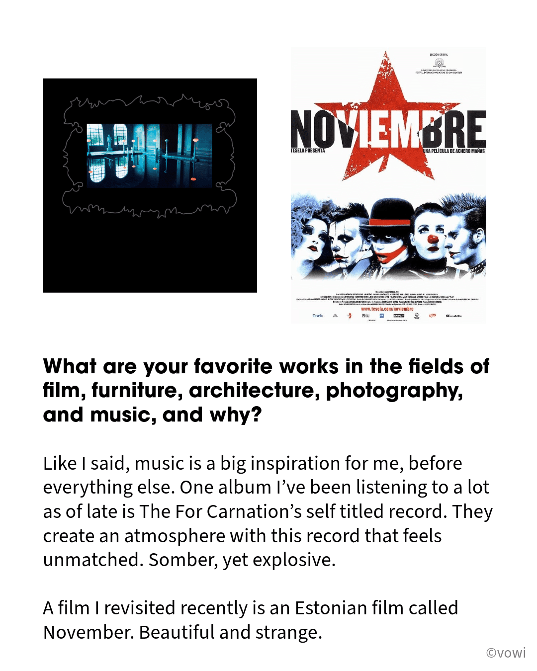 Like I said, music is a big inspiration for me, before everything else. One album I’ve been listening to a lot as of late is The For Carnation’s self titled record. They create an atmosphere with this record that feels unmatched. Somber, yet explosive. A film I revisited recently is an Estonian film called November. Beautiful and strange.