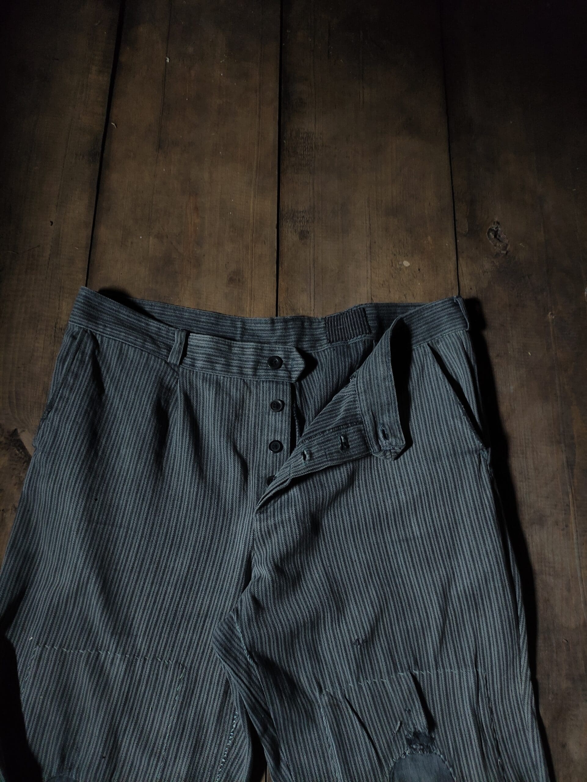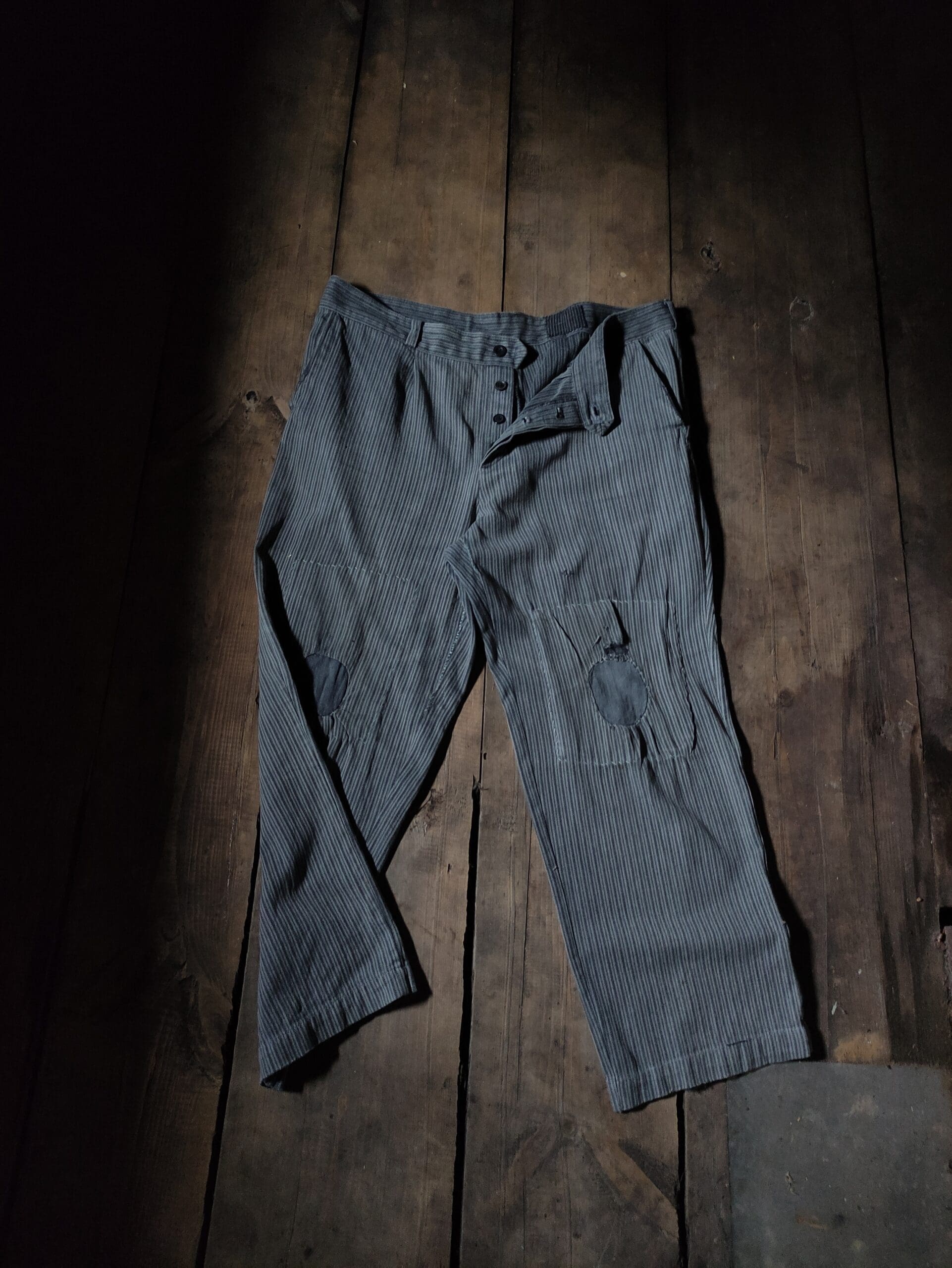 Antique work pants from the first half of the 20th century. Found in an abandoned village. The seams are additionally reinforced by hand with cotton threads. All patches are the product of the labor of people of that time.