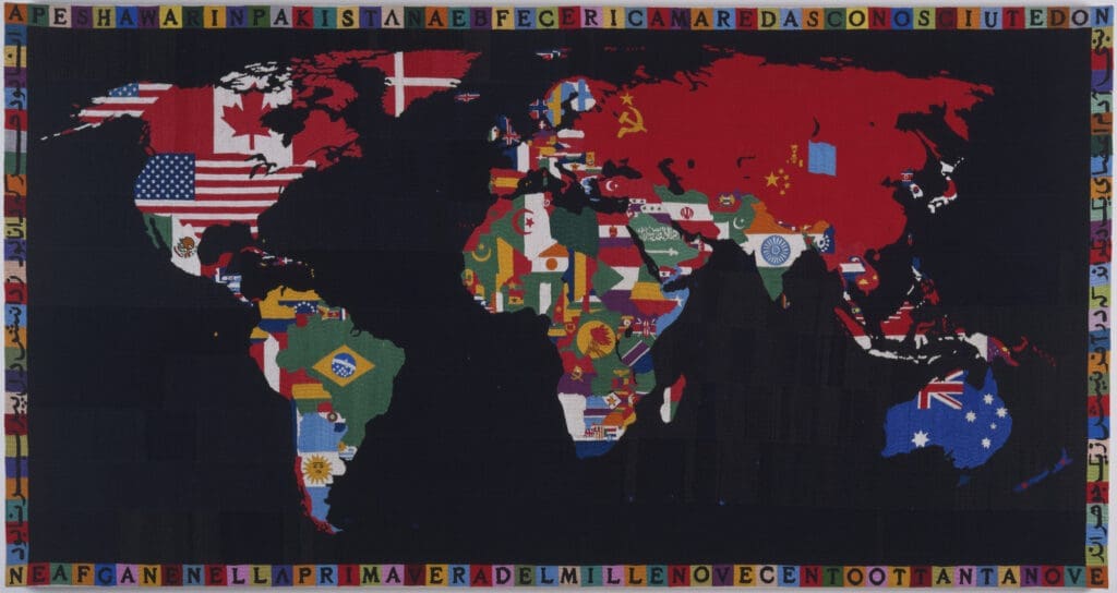 One of his best-known series, “Mappa” (1971-1994), consisted of embroidered world maps that depicted the political boundaries of countries at different points in time. These maps reflected his interest in global politics, change, and interconnectivity. Boetti’s engagement with materials and his exploration of the relationship between intellect and craft made him an important figure in the Arte Povera movement, emphasizing the intellectual and political potential of seemingly mundane objects and processes.