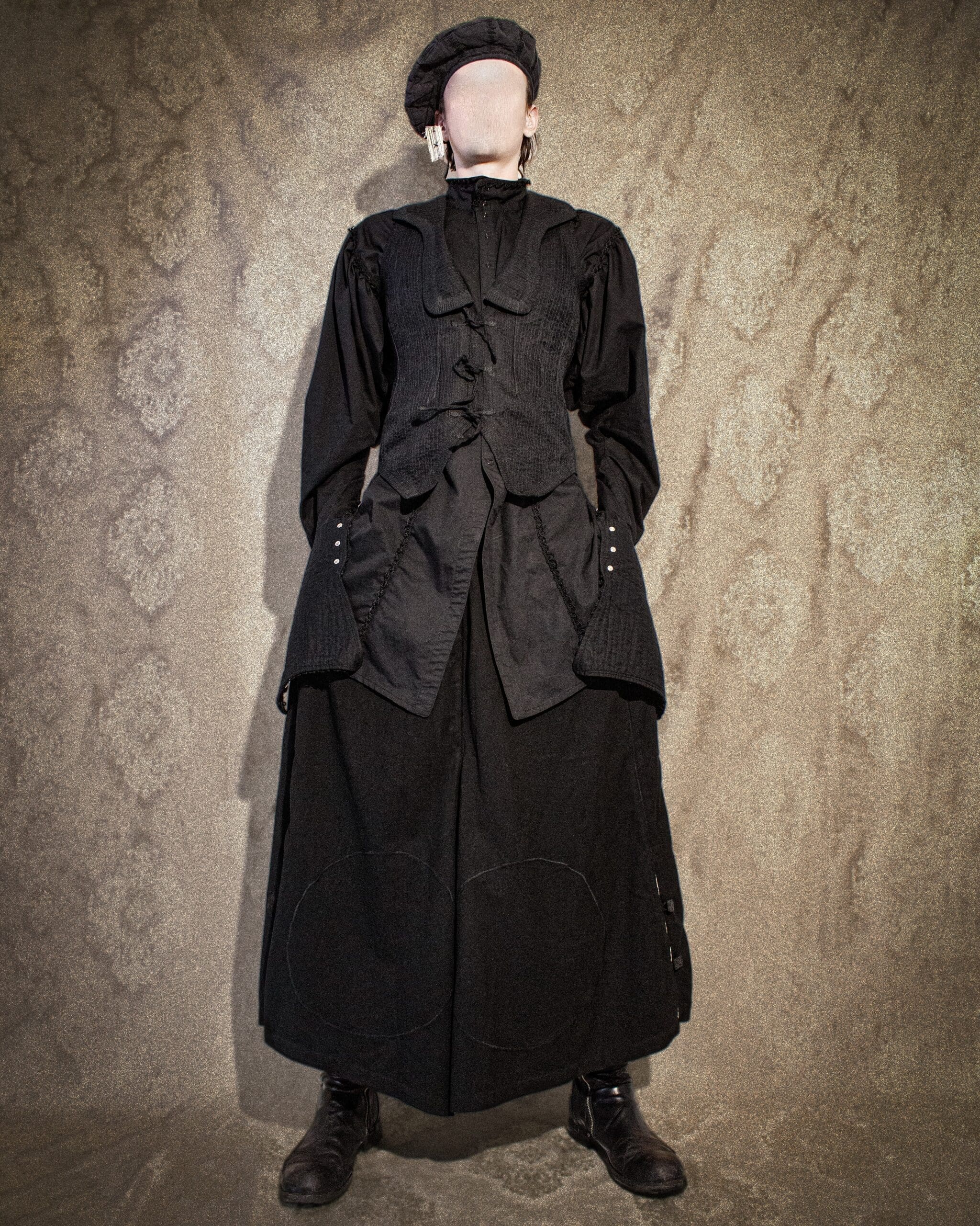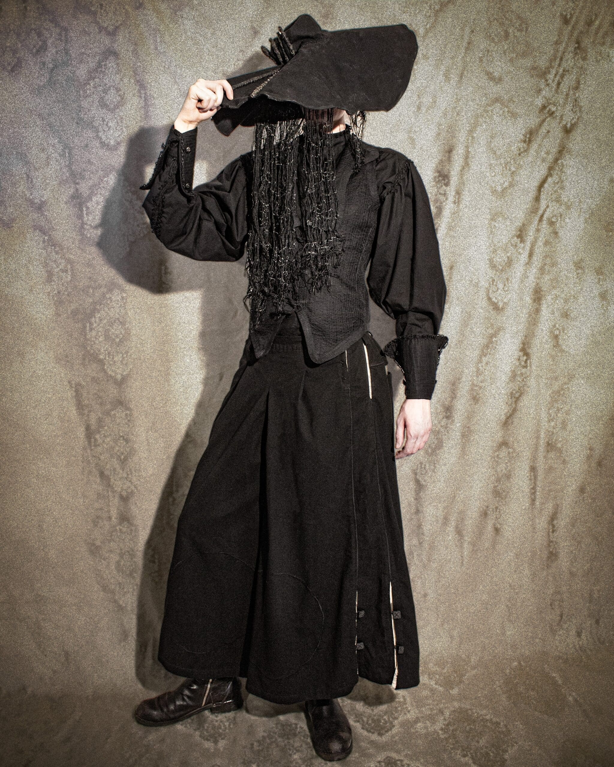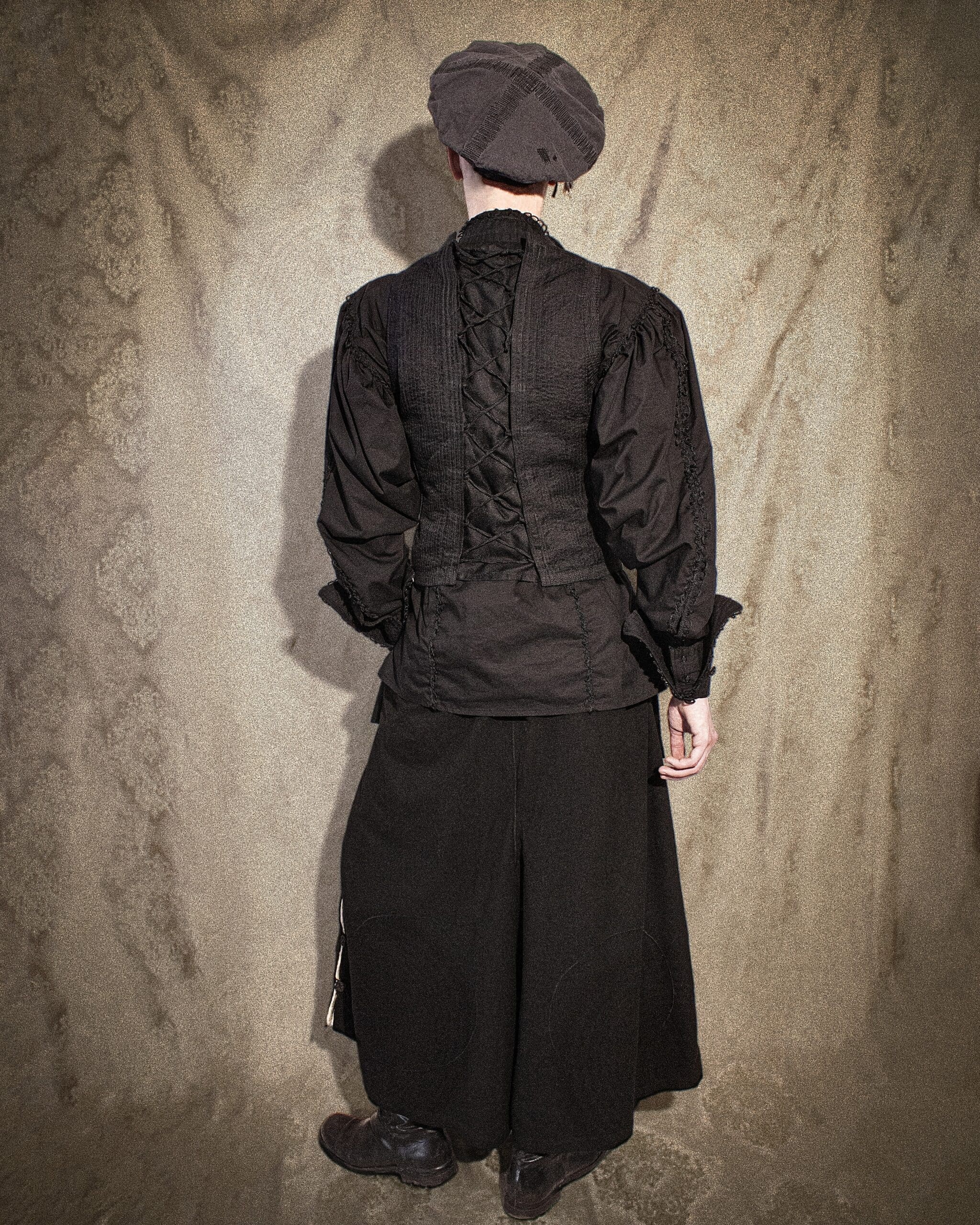 Cotton shirt with elongated front details. The sleeves are made in a historical loose cut with draperies on the shoulders and narrow lapel cuffs. The elements of the product are embroidered with braid