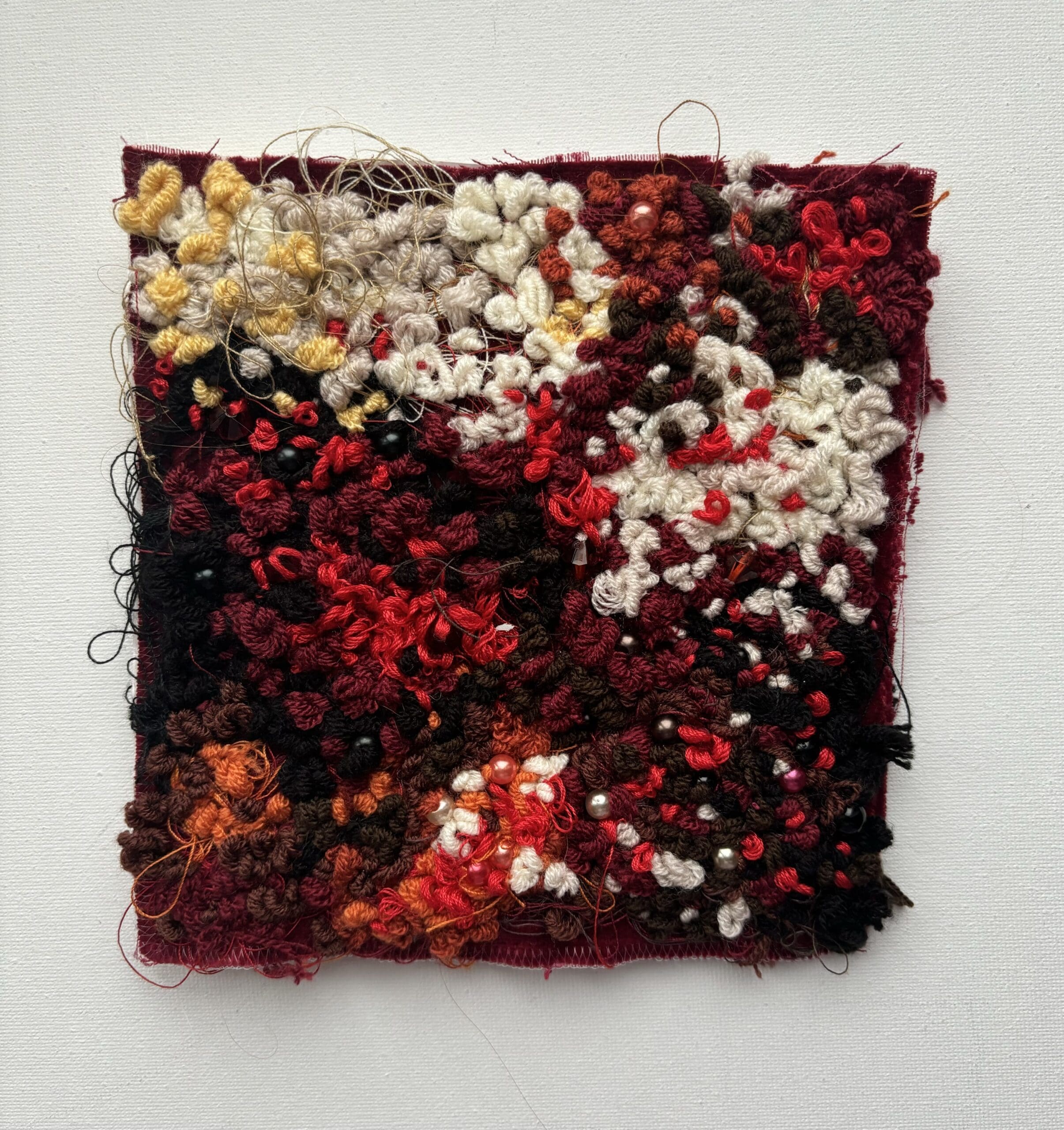 textille art 15×15 made of cuts of fabric, yarn, threads, beads