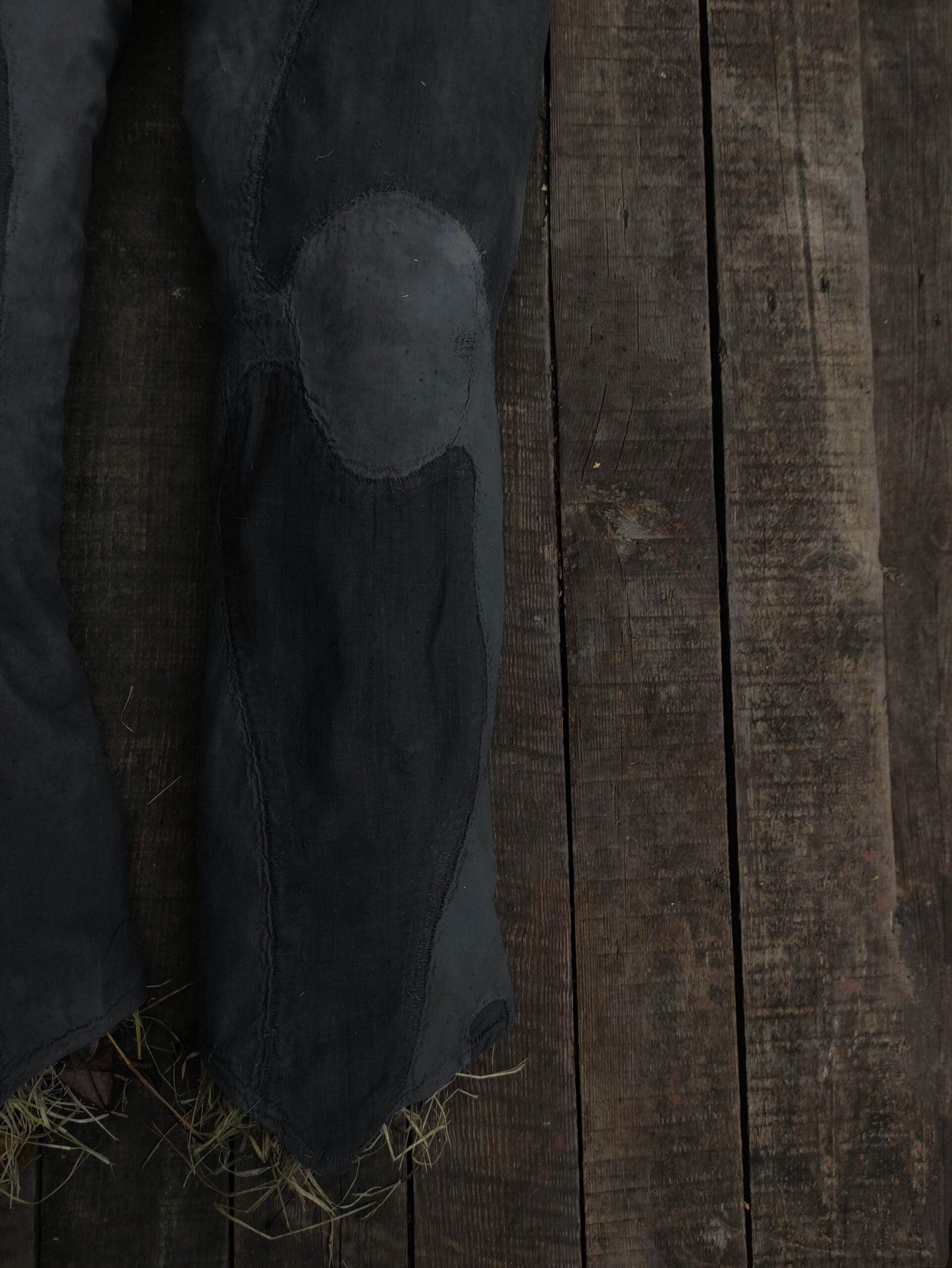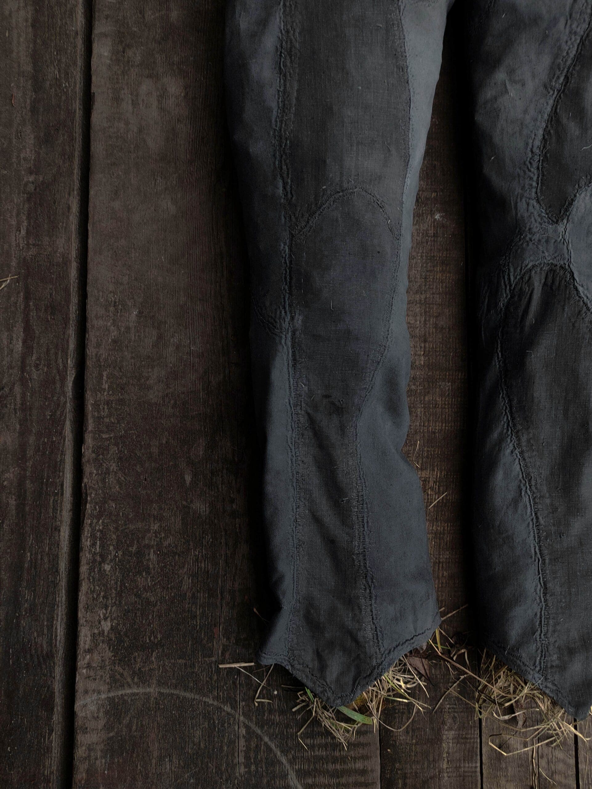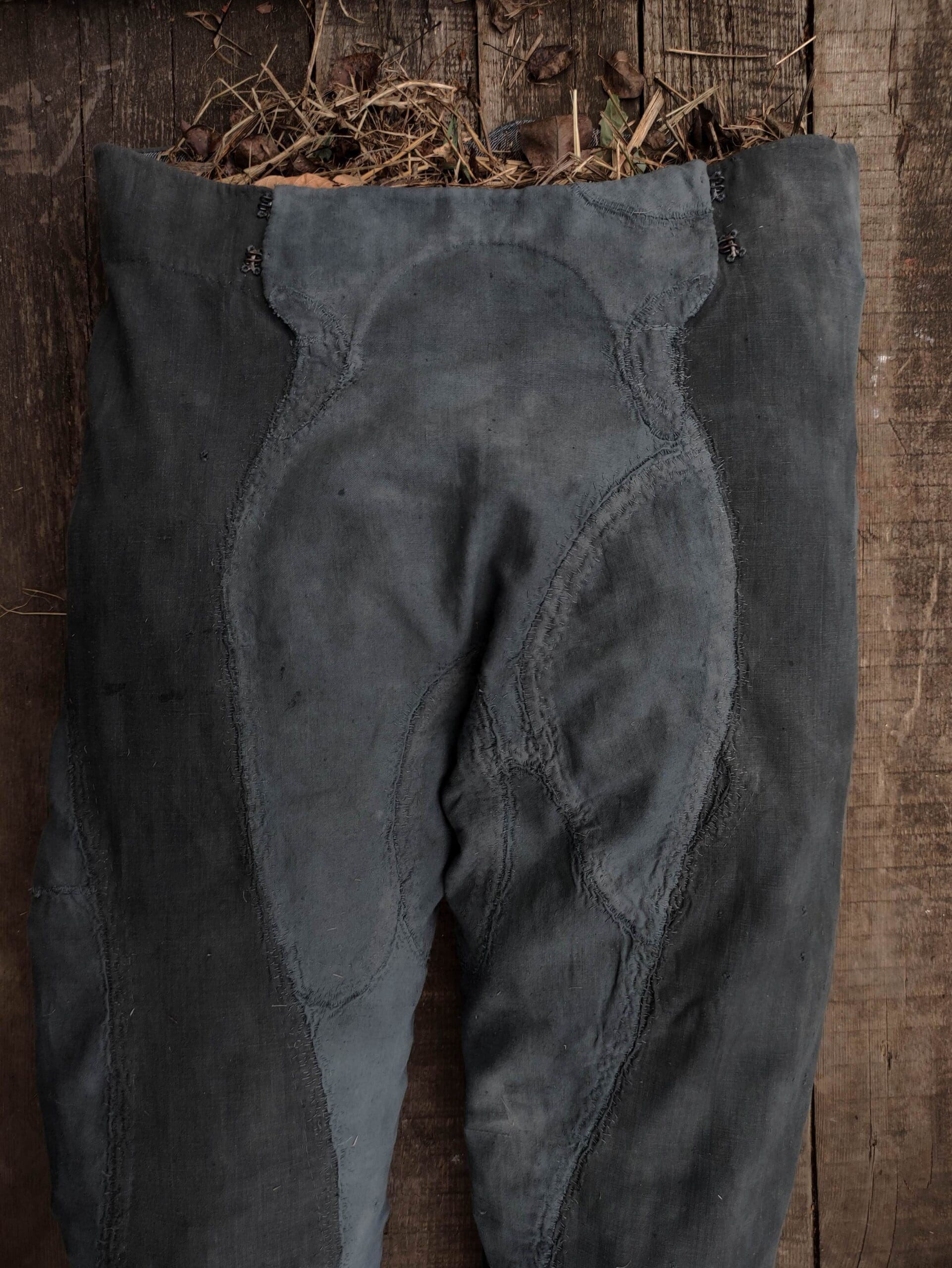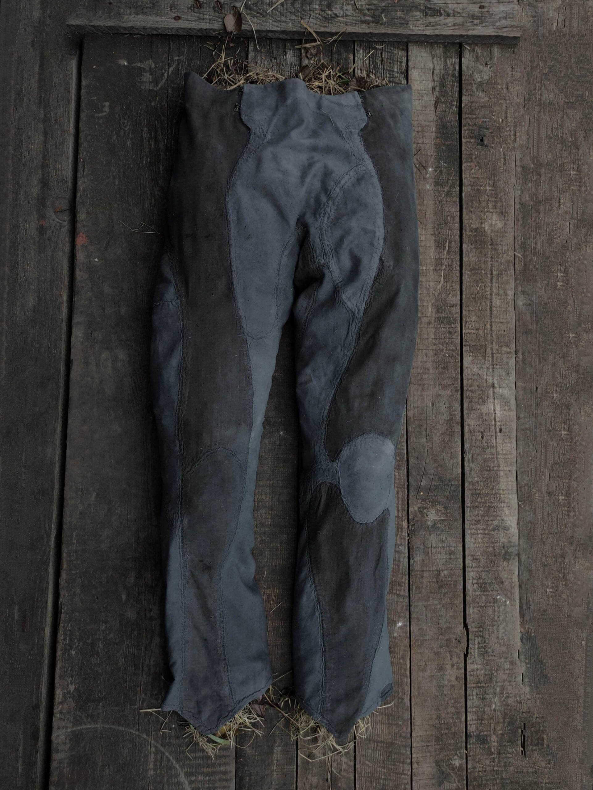 The lines that form the cut of these pants echo the stylized structure of bones and muscles, drawing attention through the main bodily nodes in which energy is concentrated.