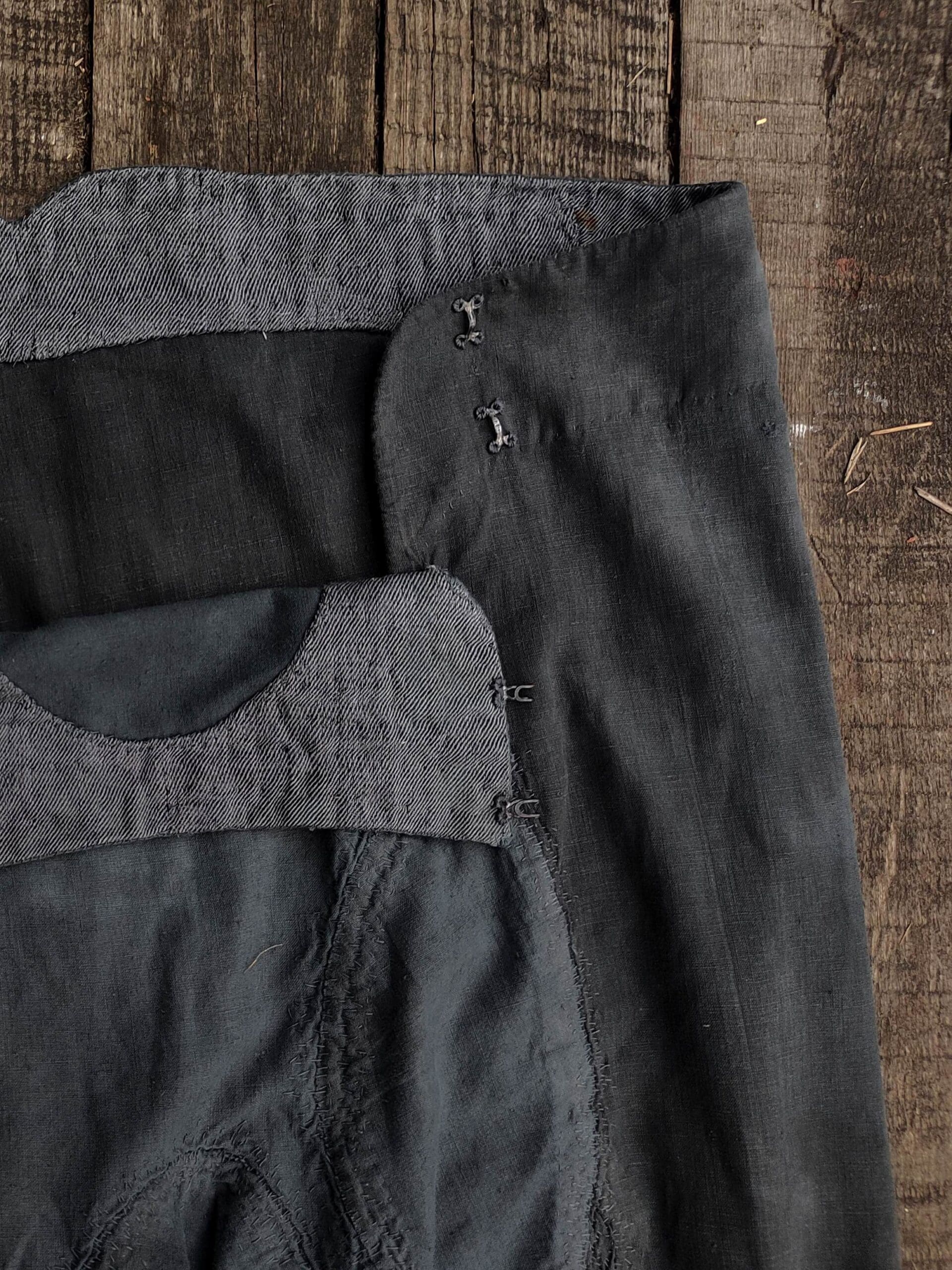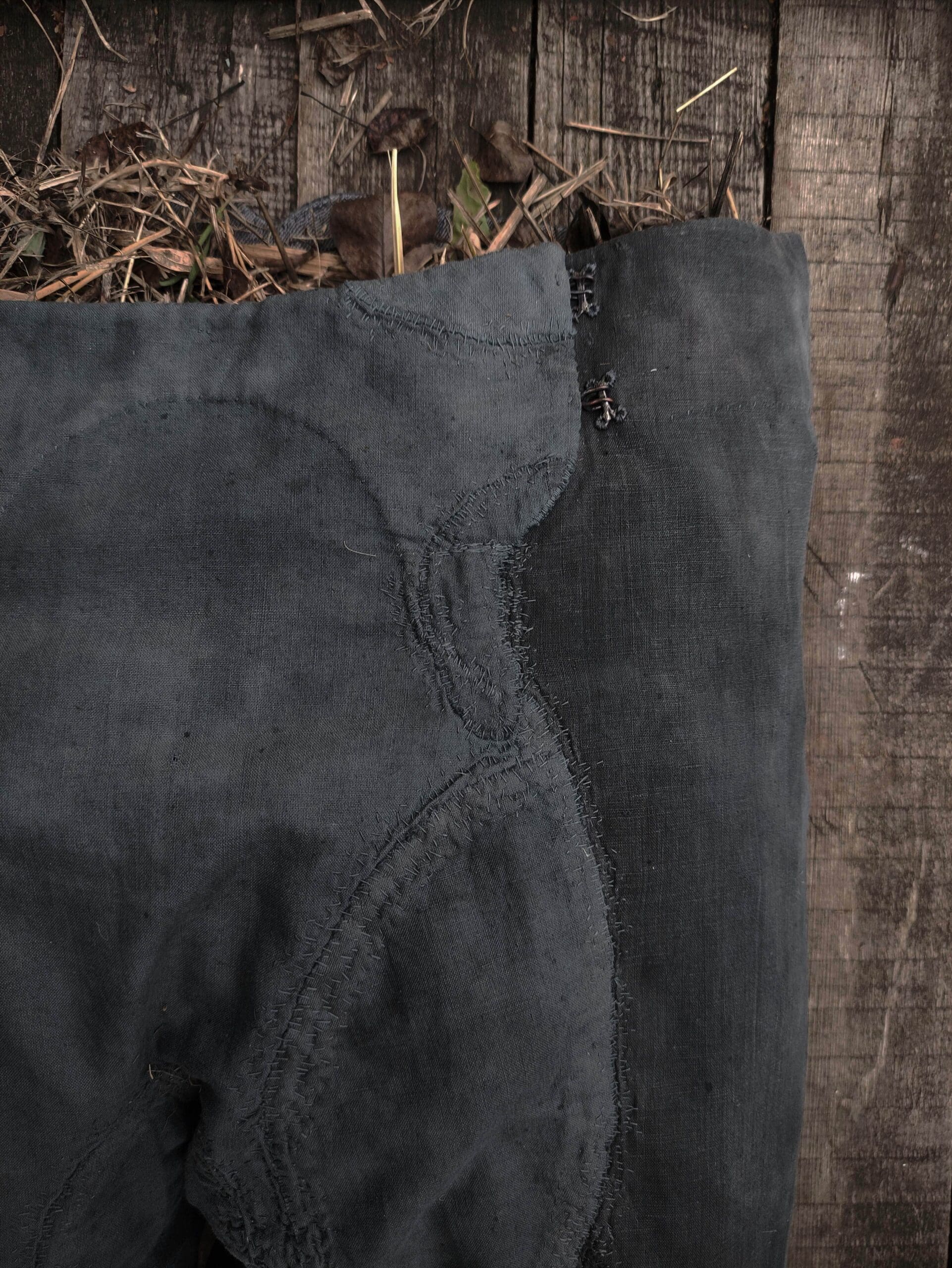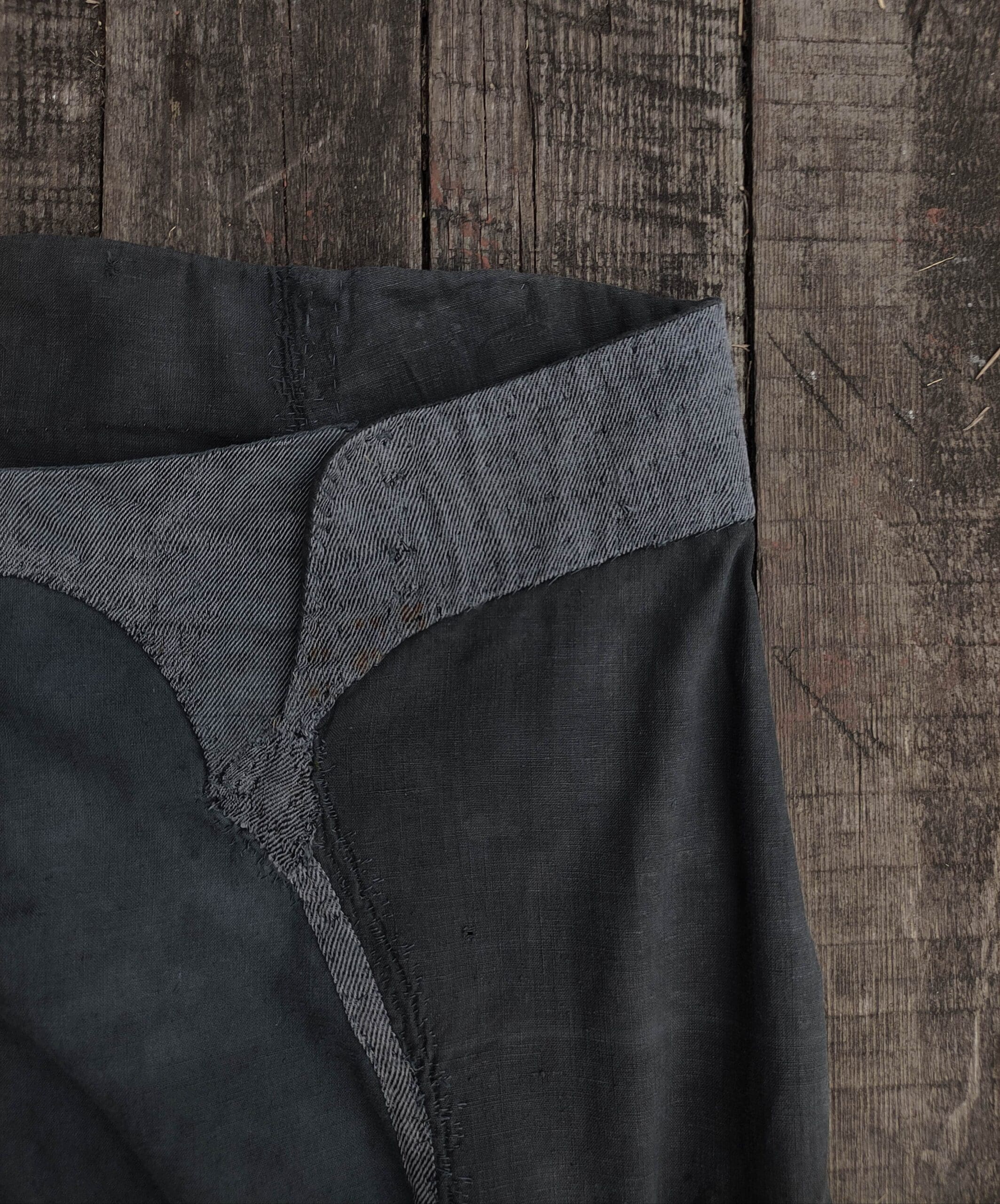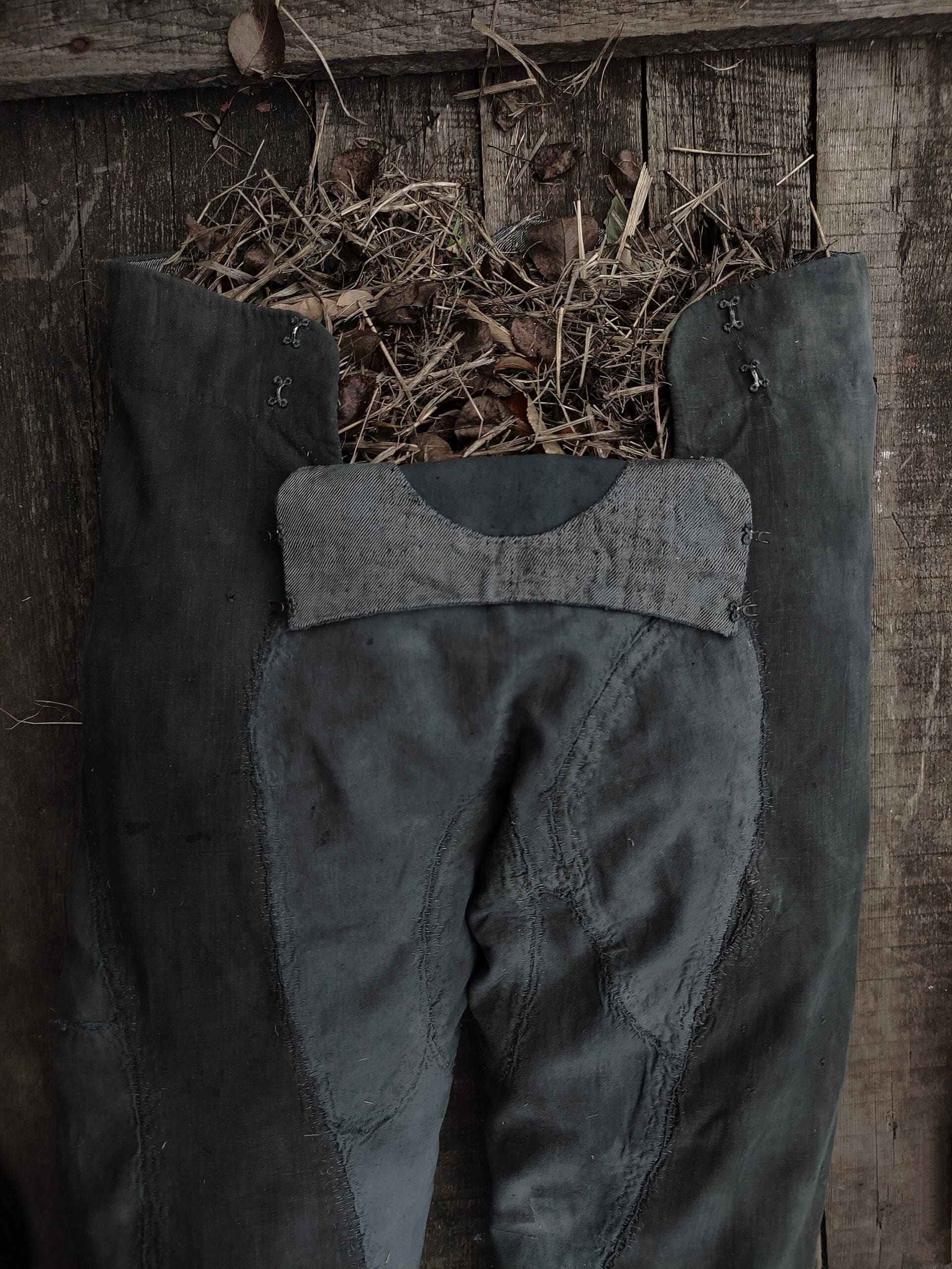 The lines that form the cut of these pants echo the stylized structure of bones and muscles, drawing attention through the main bodily nodes in which energy is concentrated.