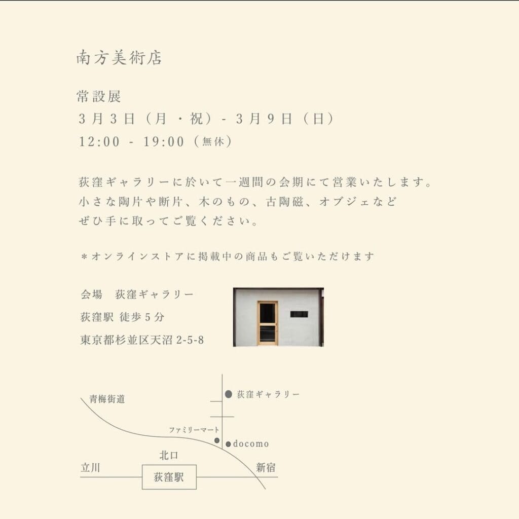 A week-long exhibition will be held at Ogikubo Gallery, featuring small ceramic fragments, wooden objects, antique ceramics, and art pieces. Visitors are welcome to explore and appreciate these works in person.