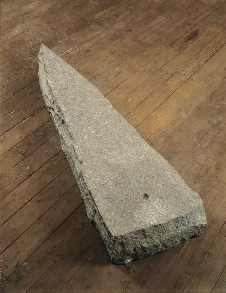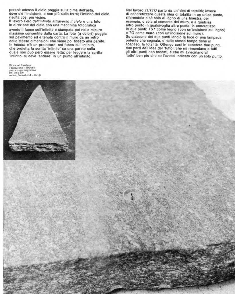 Direzione (Direction), 1967–68 – Another key piece from this period, Direzione involves a large block of granite into which a magnetic compass is embedded. The compass needle, set flush in the stone, aligns with the Earth’s magnetic north, and the entire block is oriented in the gallery so that the triangular tip of the stone points the same way