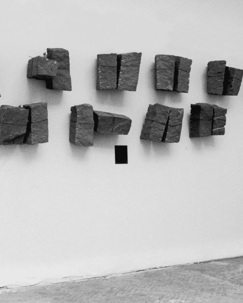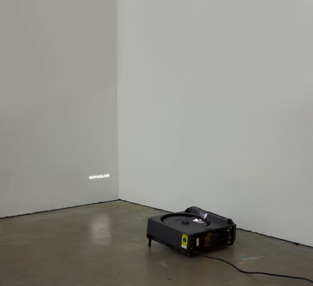 Other notable works by Anselmo include Particolare (Detail), a conceptual installation first made in 1972. In Particolare, a slide projector beams the word “particolare” onto a specific object or section of the exhibition space – for example, onto a stone or a wall. The projected word remains sharply in focus only on that one fragment, emphasizing the idea of particularity in contrast to the surrounding environment