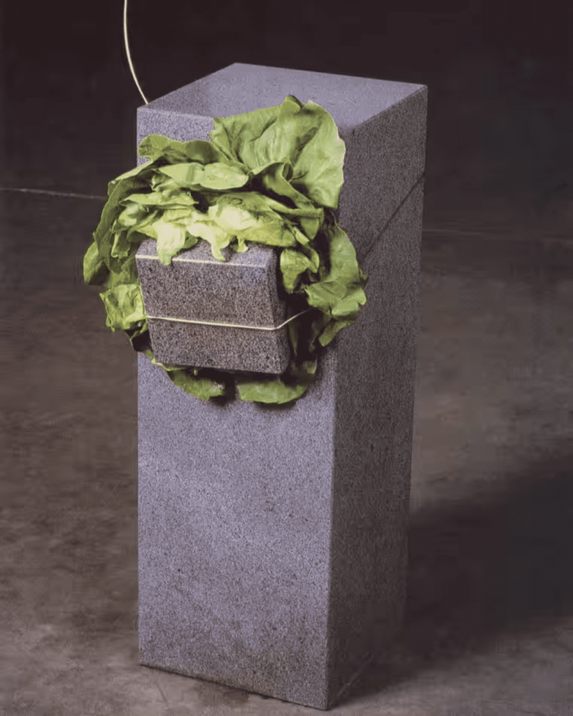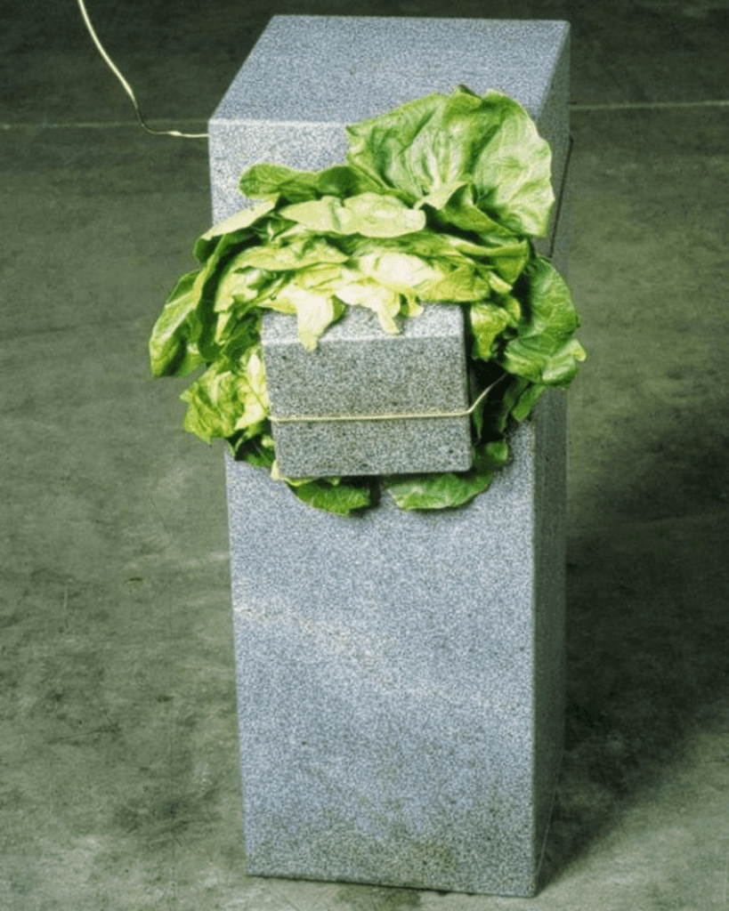 The only way to prevent this is to periodically “feed” the work by replacing the lettuce with a fresh piece. This simple but powerful configuration brings together hard, seemingly eternal stone and perishable vegetal matter. The work is a meditation on time, growth, and decay: it dramatizes the tension between permanence and ephemerality. Viewers experience a palpable sense of suspense, aware that natural decay could undo the balance at any moment