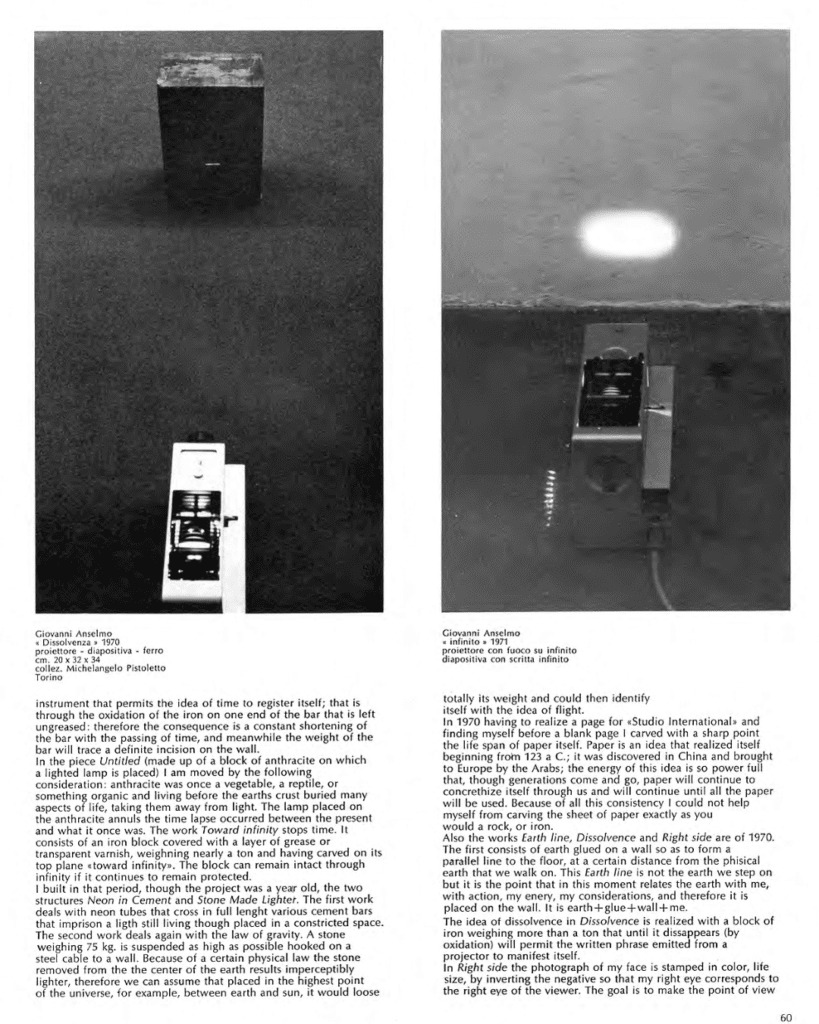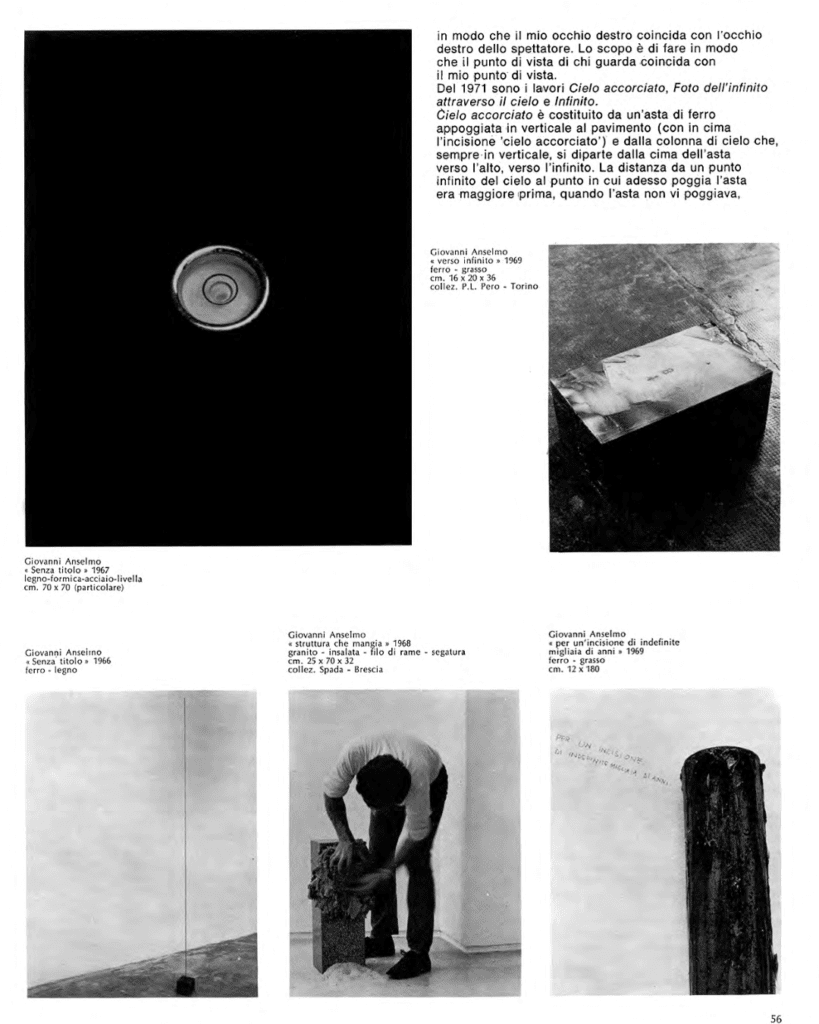 presenting works that immediately signaled his unconventional approach to materials and form. These early exhibitions launched Anselmo’s public career and aligned him with a generation of young Italian artists who were forging a new artistic movement.