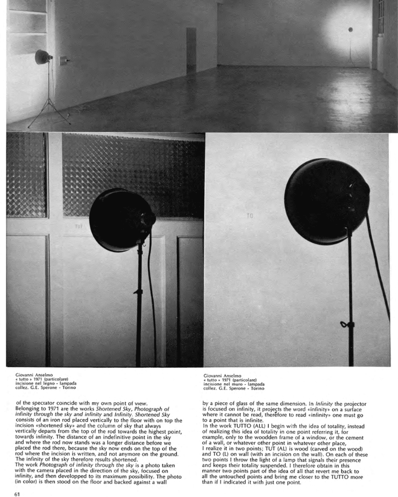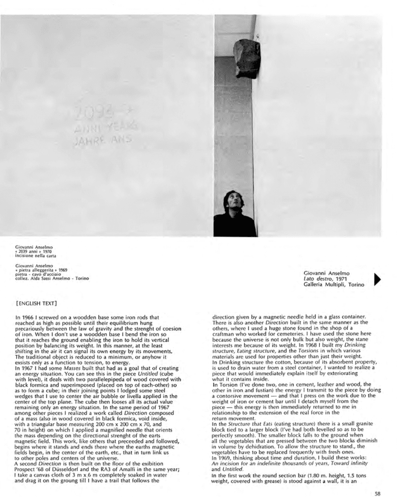 For example, art historian Carolyn Christov-Bakargiev, in her authoritative book Arte Povera (1999), described Anselmo as one of the movement’s most “original and lyrical” artists