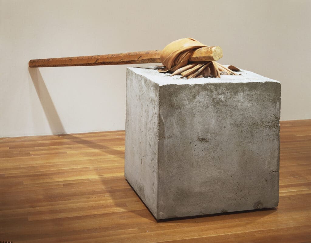 Torsion (Torsione), 1968 – Created in the same year, Torsion is another early Anselmo work that literalizes force and potential energy. It features a rectangular block of cement into which a length of leather or fabric is embedded; this cloth is twisted tightly around a sturdy wooden rod or bar