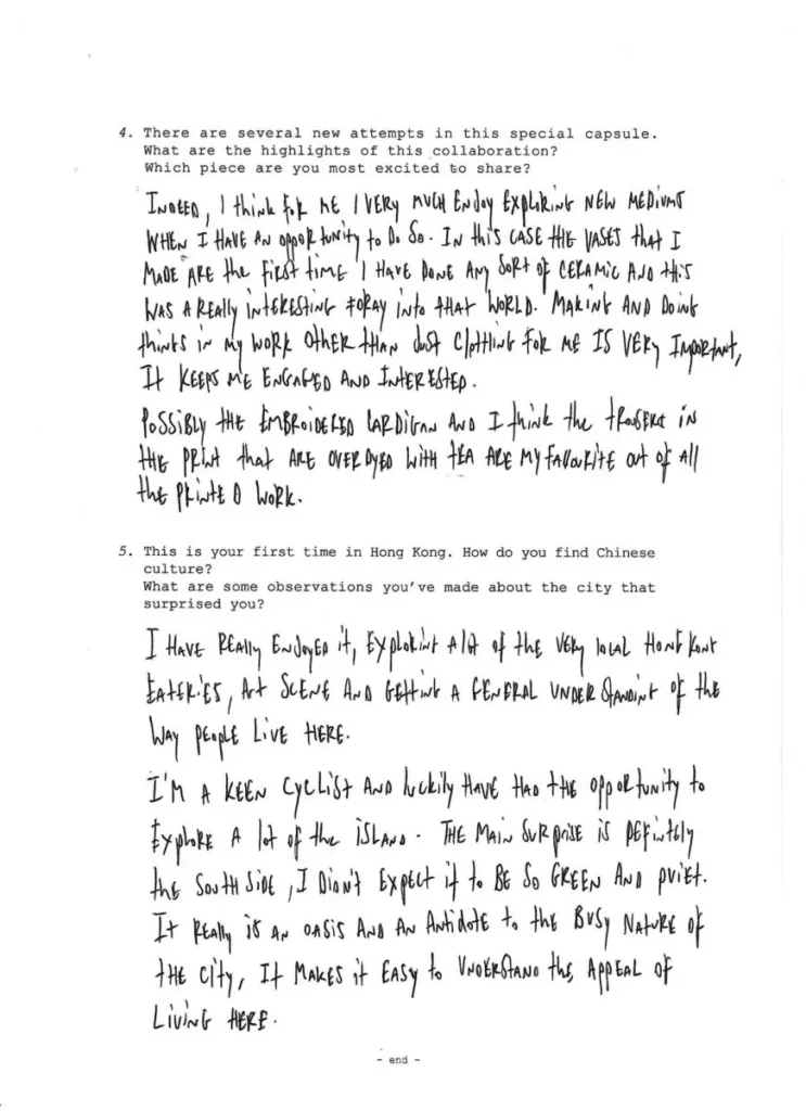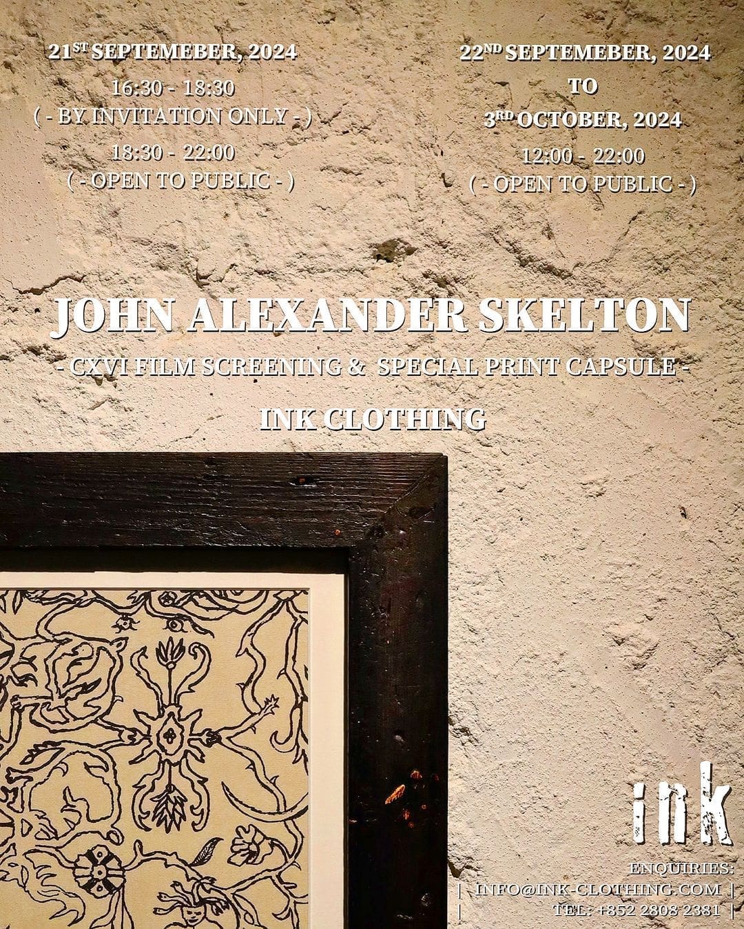 Starting from September 21, 2024, John Alexander Skelton, in collaboration with ink, hosted the premiere of his CXVI (AW24 collection) short film and the first special collection release event. Drawing inspiration from his 16th collection, John directed and filmed a piece, marking his first visit to Asia, where he hosted the premiere event at the ink store and interacted with fans. Additionally, John designed exclusive patterns for the event, resulting in a limited series of clothing, and created handcrafted chalice-shaped candle holders (only 11 pieces).