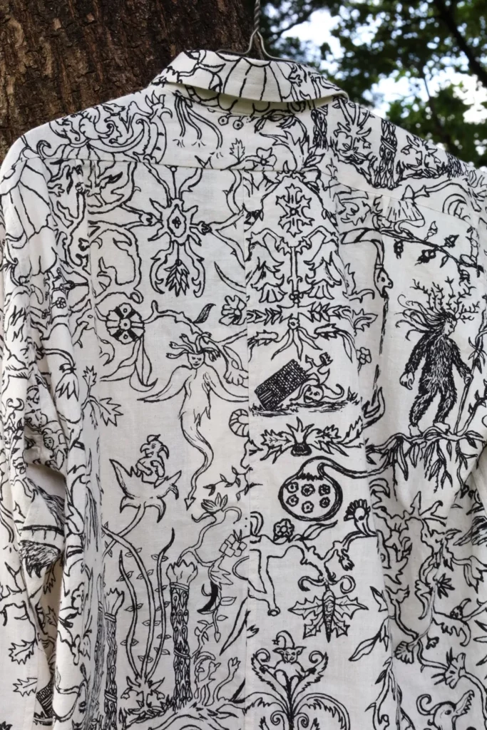 The inspiration behind this pattern comes from my AW24 collection, which is my interpretation of the works of the band This Mortal Coil. Essentially, I had Oliver listen to their music and provided him with notes about the collection that he was already familiar with. Their music has a very ethereal and almost Gothic feel, which led me to explore the Gothic movement through early forms of art and architecture. This became the foundation for Oliver to create the print, but equally important is that he also brought his own world into it.