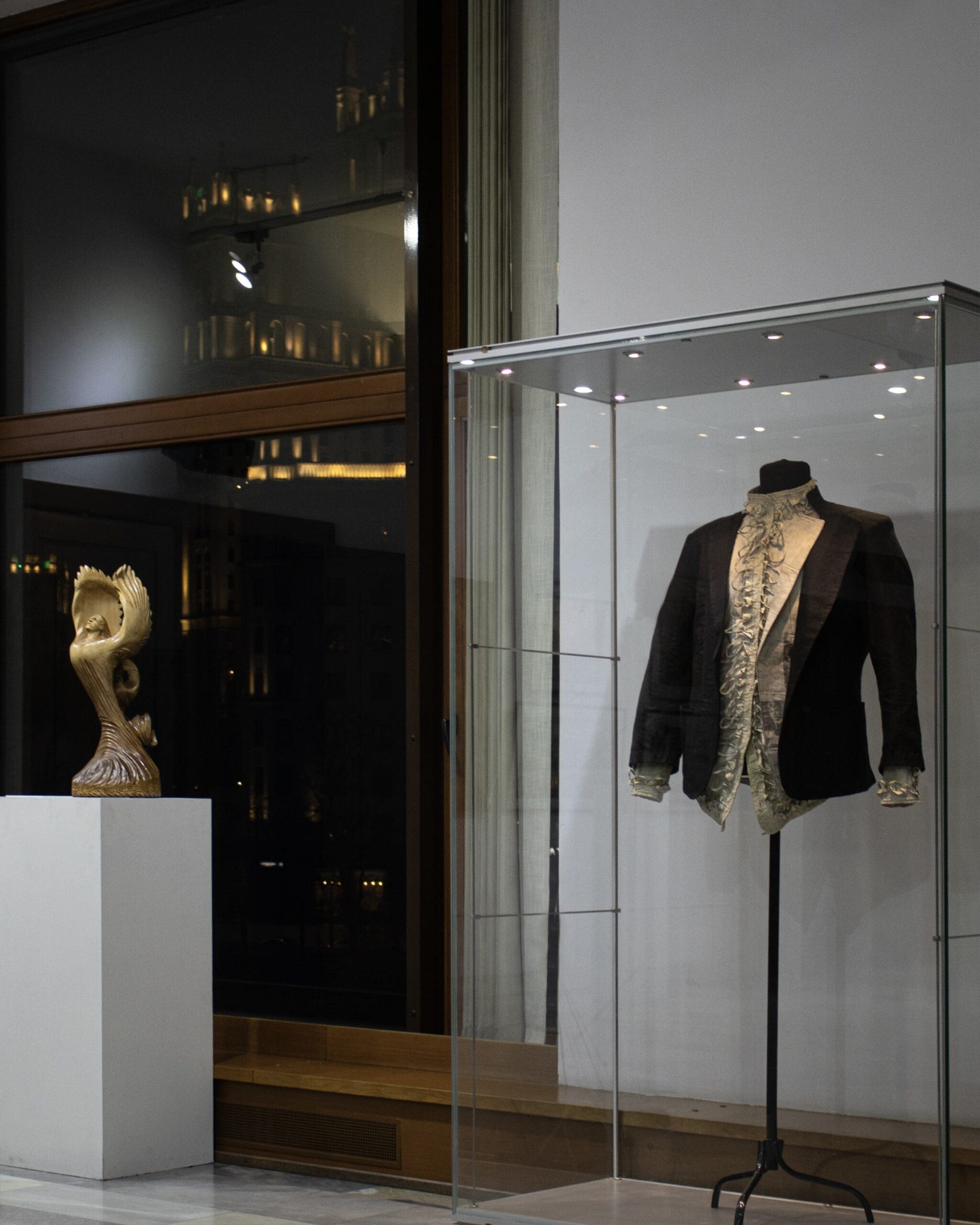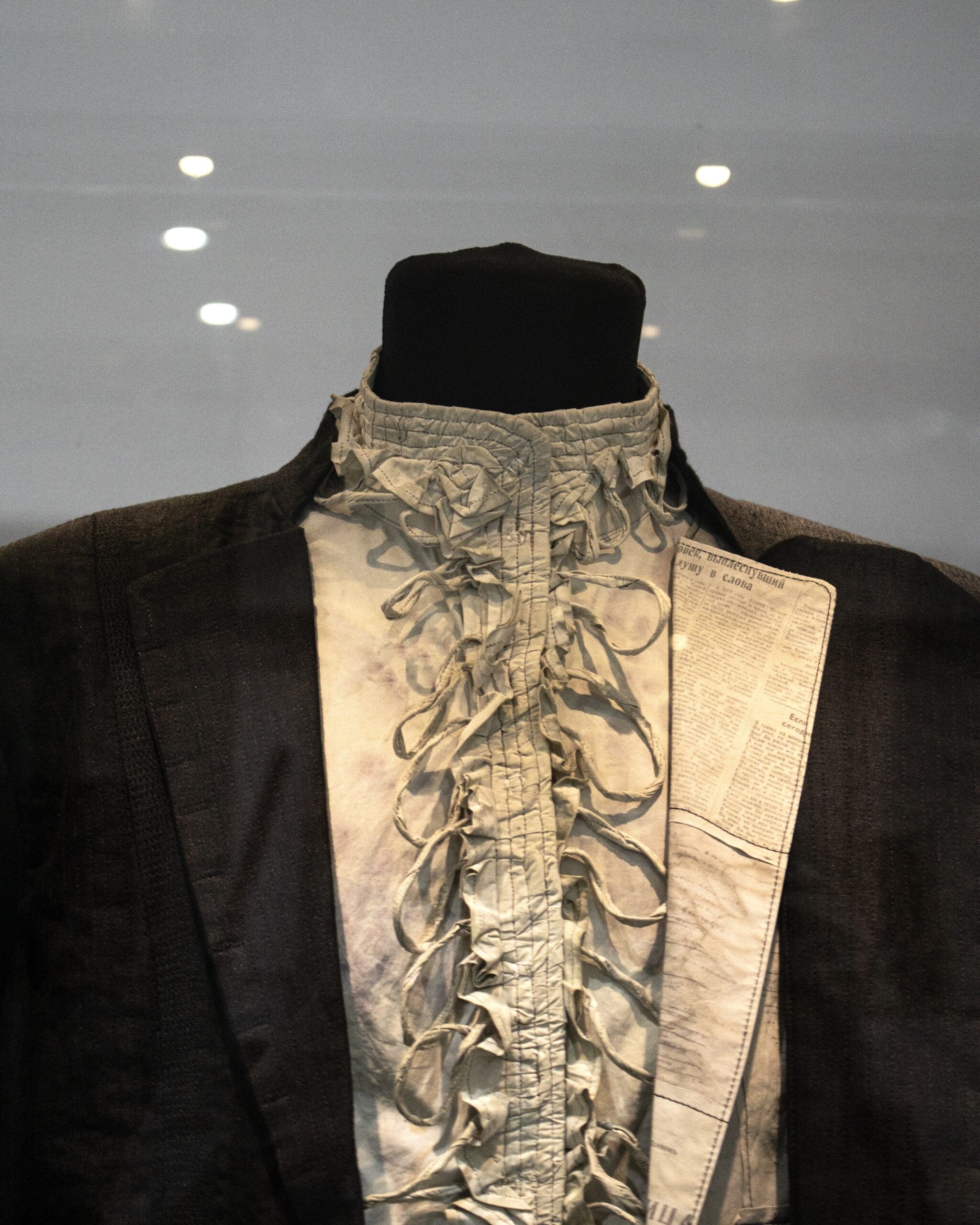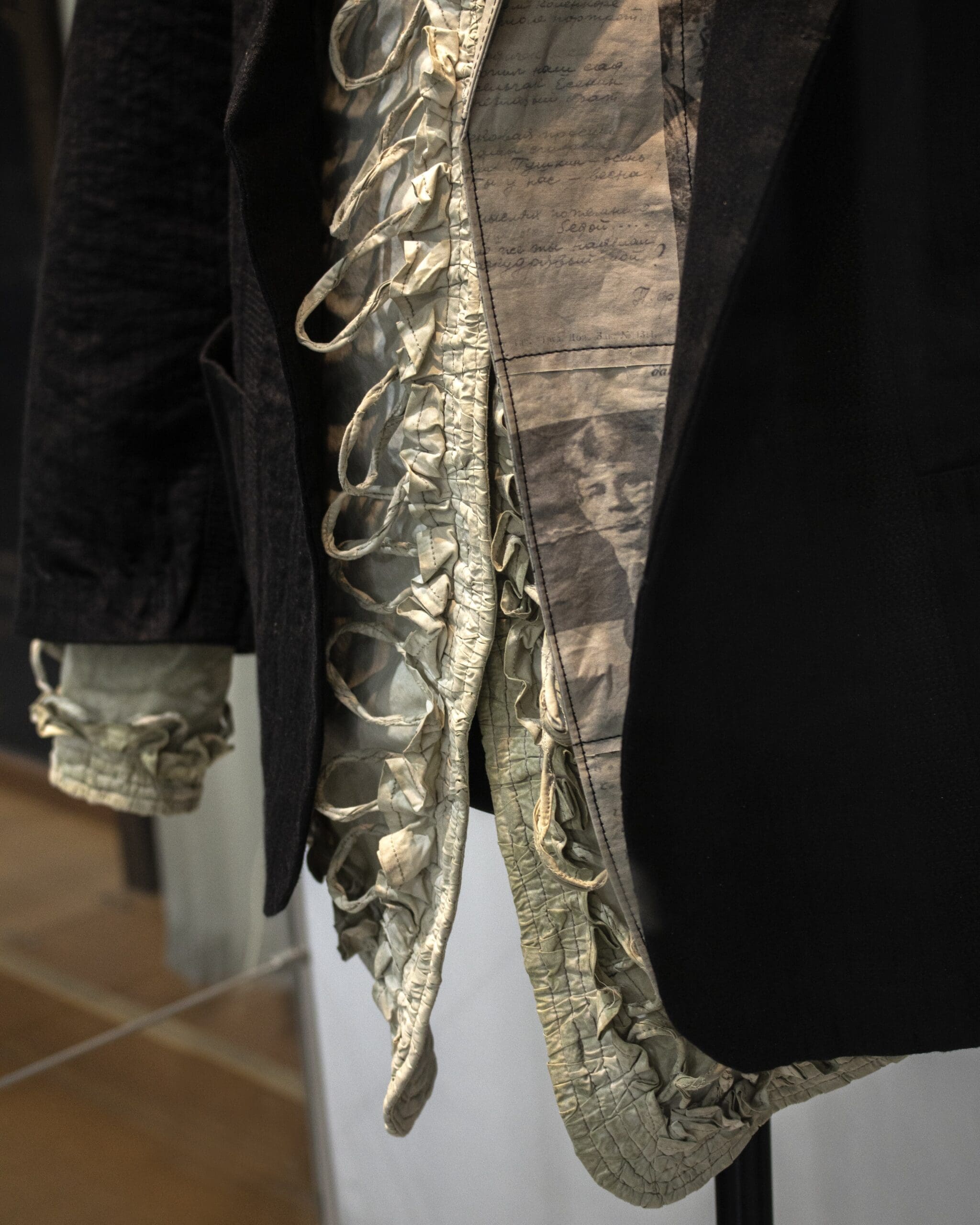 The jacket’s hidden lapel is composed of manuscripts and newspaper articles.