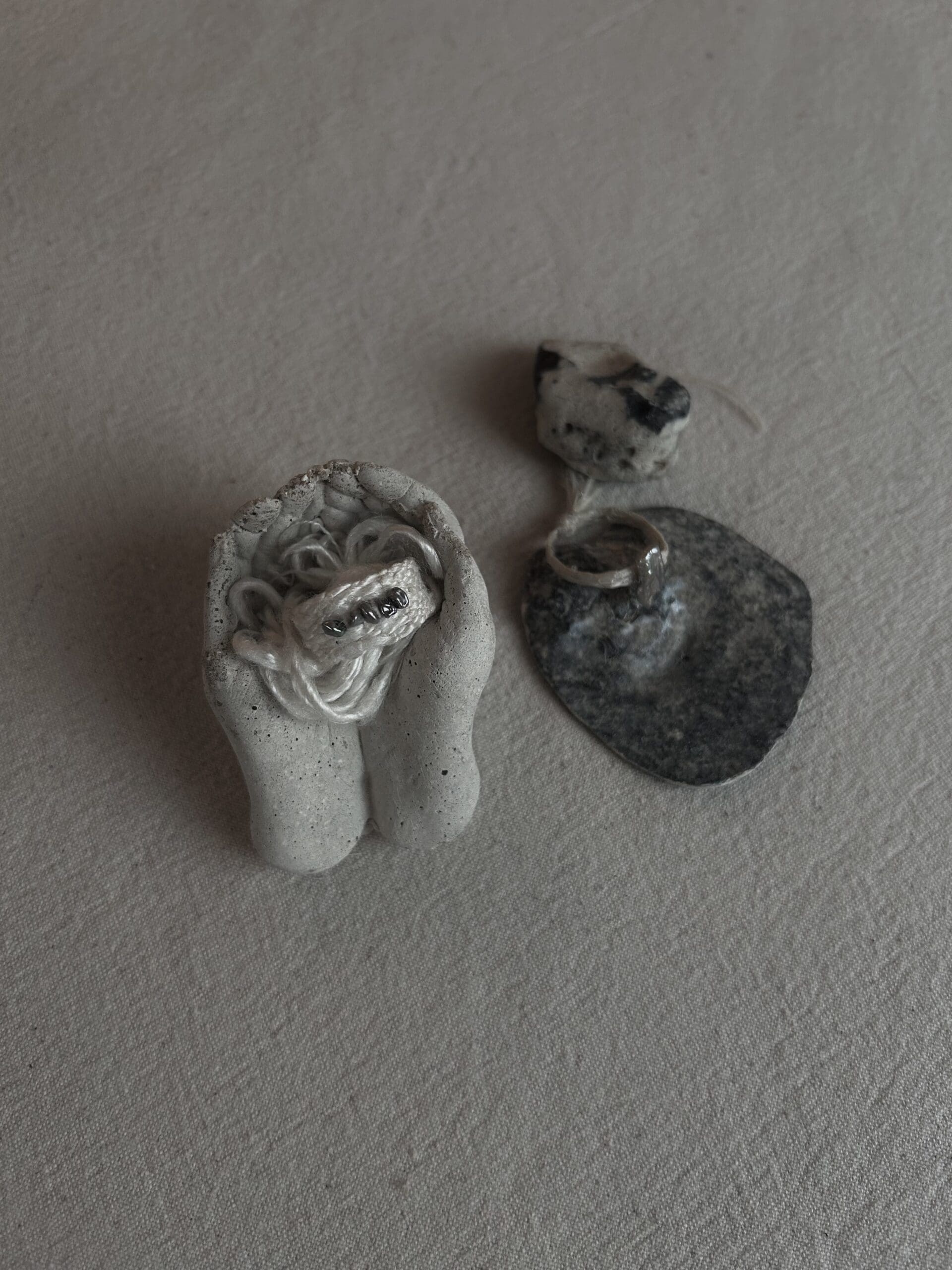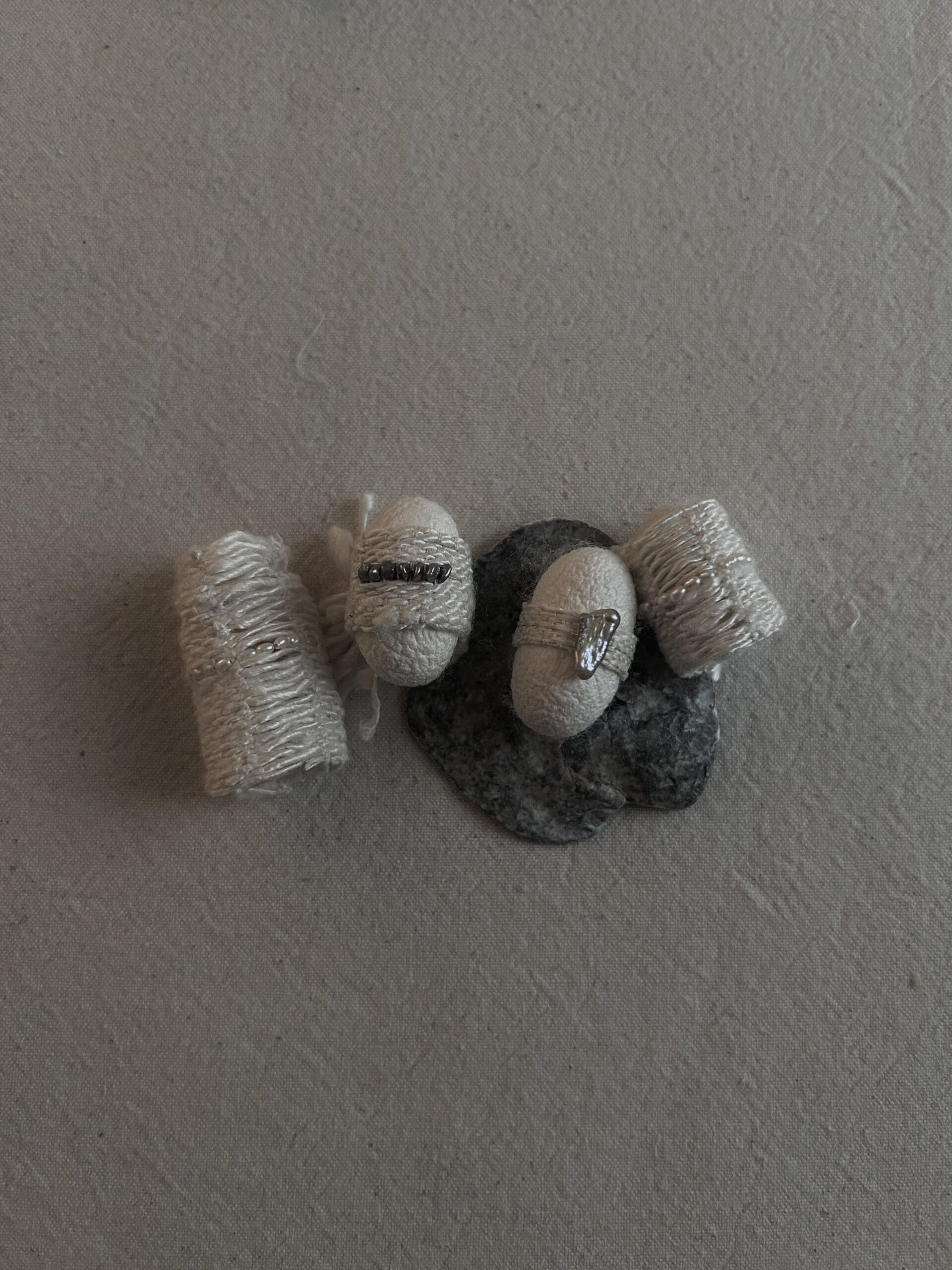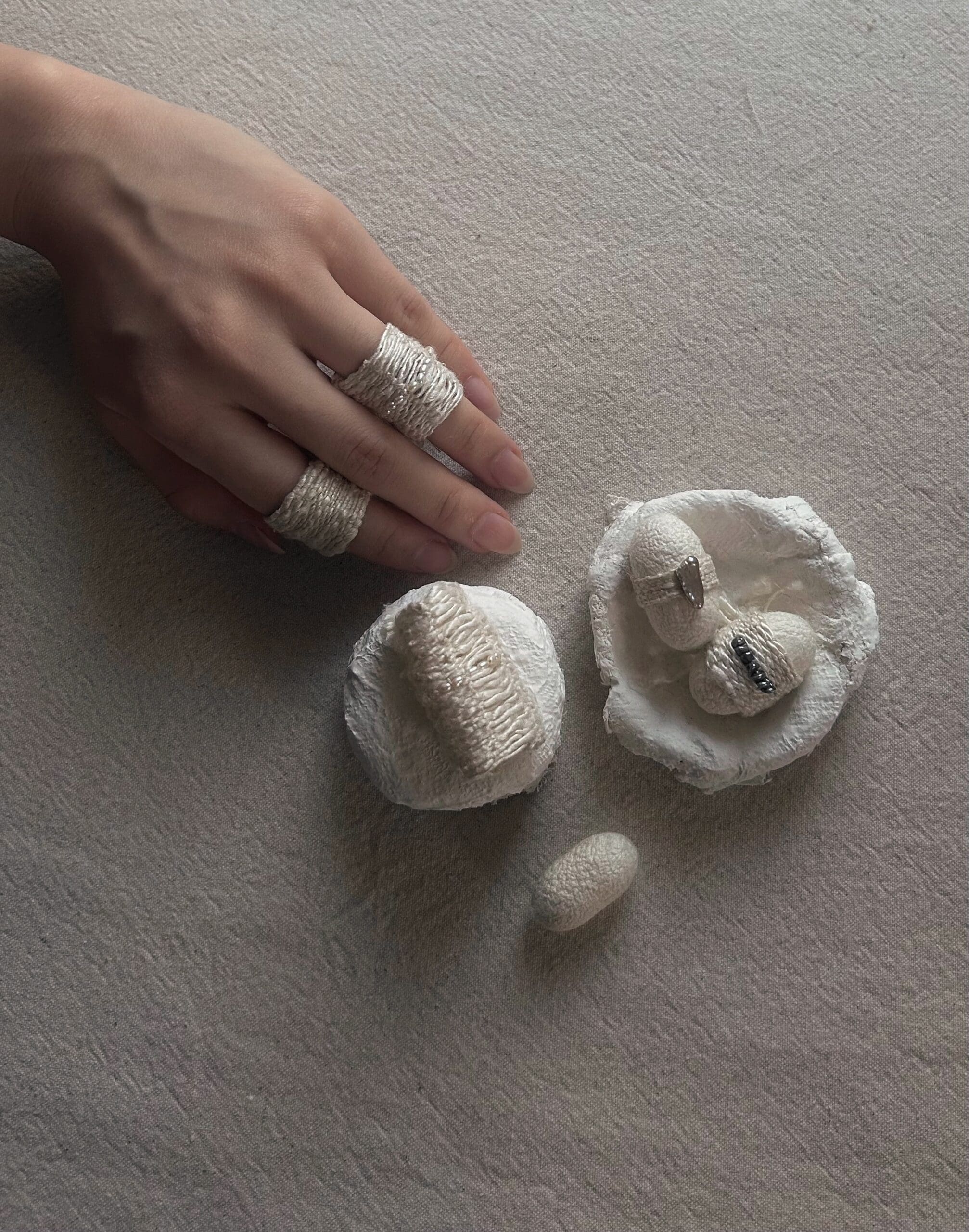 rings: woven out of hand spun mulberry silk, and natural pearls.
