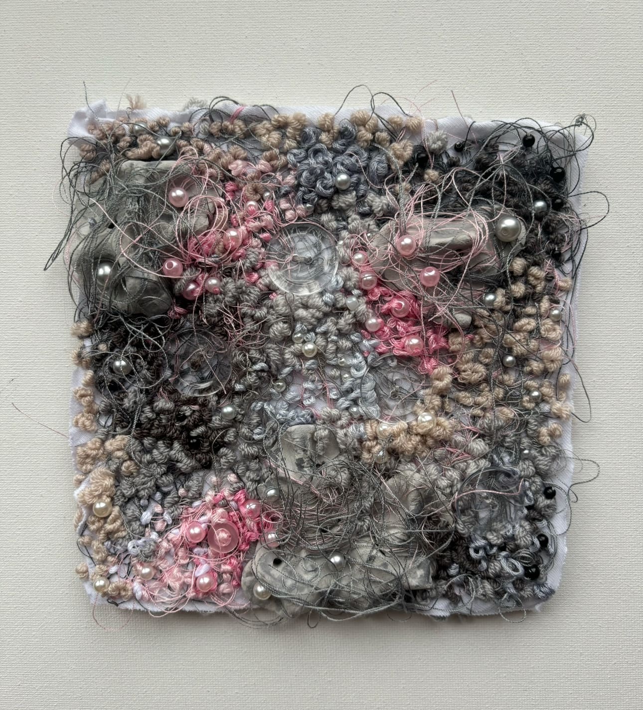 textille art 15×15 made of cuts of fabric, yarn, threads, beads